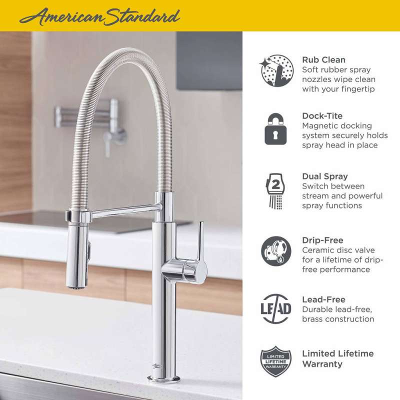 More than a professional look, the Studio S Semi Pro Dual-Spray Kitchen Faucet with Spring Spout from American Standard combines commercial-inspired design thoughtfully engineered for today's home. Contemporary cylinder base with raised, one-piece lever handle and flexible stainless steel coil lends an impressive gourmet touch. Allowing easy maneuverability and ample room for filling large pots, this hardworking faucet is softened by a slightly flared, pull-down spray head that's easy to grasp and offers stream and powerful spray functions. The perfect choice for a complete kitchen makeover or easy update, Studio S promises drip-free dependability and adds five-star distinction to your kitchen design.