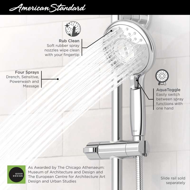 The Spectra+ Handheld 4-function hand shower from American Standard has all the functionality of a stable shower head, with the convenience of a hand shower. The Spectra+ hand shower allows each user to select from either a Drench, Sensitive, Powerwash, and Massage setting for a custom shower experience that will maximize your relaxation and showering experience.