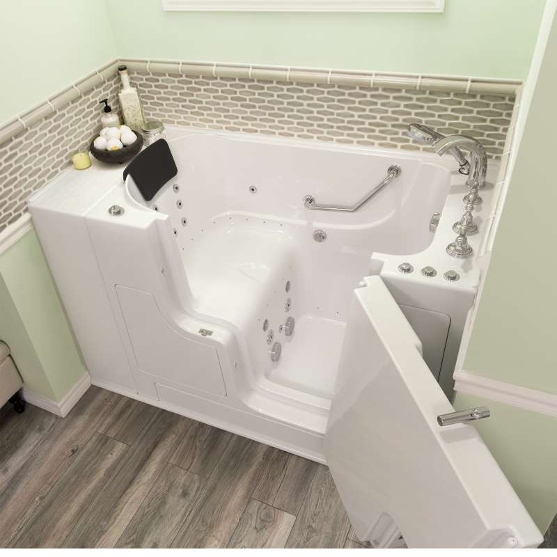 The American Standard 30-in x 52-in Gelcoat walk-in bath provides a similar bathing experience to larger models but fits in smaller spaces and uses less water. The included tub extender allows this tub to retrofit in the same space as a standard bathtub. The full sized, outward opening, contoured door with a low door threshold allows ease of entry and exit. Fully equipped, the 109 Premium Series offers all the latest in safety and comfort features with the most advanced therapeutic options and backed by a lifetime warranty on the door seal, a 10 year warranty on the tub shell and a 5 year warranty on all other components.