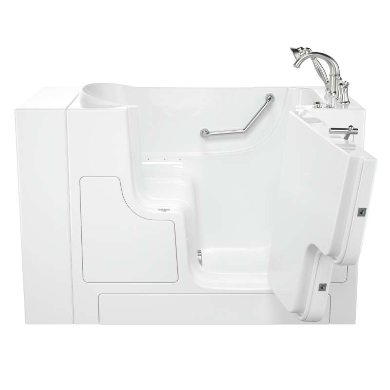 The American Standard 30-in x 52-in Gelcoat walk-in bath provides a similar bathing experience to larger models but fits in smaller spaces and uses less water. The included tub extender allows this tub to retrofit in the same space as a standard bathtub. The full sized, outward opening, contoured door with a low door threshold allows ease of entry and exit. Fully equipped, the 709 Value Series offers all the latest in safety and comfort features with the most advanced therapeutic options and backed by a lifetime warranty on the door seal, a 10 year warranty on the tub shell and a 5 year warranty on all other components.