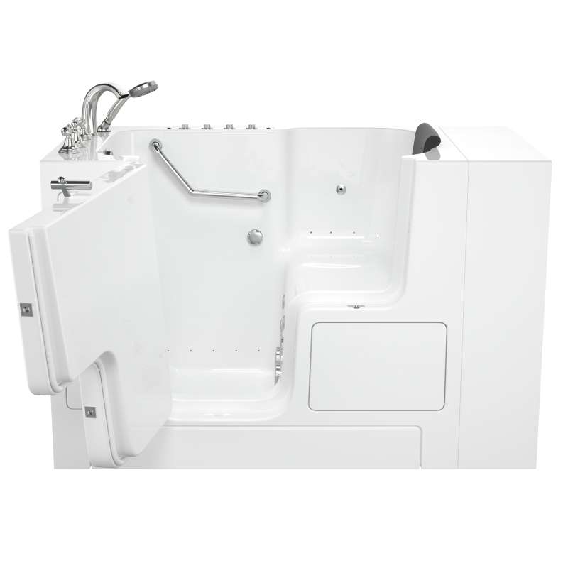 The American Standard 32-in x 52-in Gelcoat walk-in bath provides a similar bathing experience to larger models but fits in smaller spaces and uses less water. The included tub extender allows this tub to retrofit in the same space as a standard bathtub. The full sized, outward opening, contoured door with a low door threshold allows ease of entry and exit. Fully equipped, the 109 Premium Series offers all the latest in safety and comfort features with the most advanced therapeutic options and backed by a lifetime warranty on the door seal, a 10 year warranty on the tub shell and a 5 year warranty on all other components.