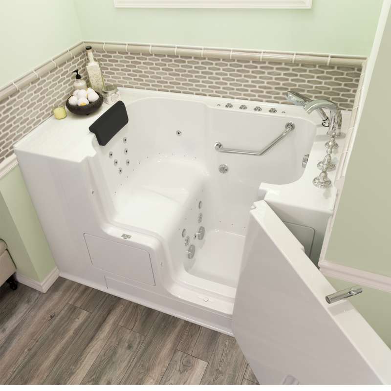 The American Standard 32-in x 52-in Gelcoat walk-in bath provides a similar bathing experience to larger models but fits in smaller spaces and uses less water. The included tub extender allows this tub to retrofit in the same space as a standard bathtub. The full sized, outward opening, contoured door with a low door threshold allows ease of entry and exit. Fully equipped, the 109 Premium Series offers all the latest in safety and comfort features with the most advanced therapeutic options and backed by a lifetime warranty on the door seal, a 10 year warranty on the tub shell and a 5 year warranty on all other components.