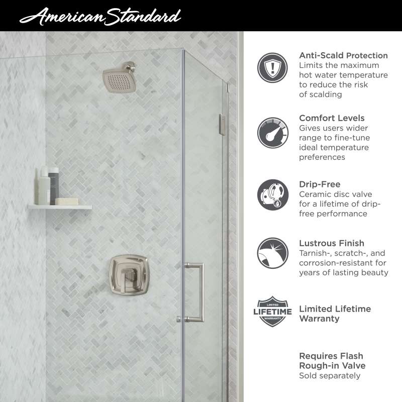 Graceful lines and superior performance set the Crawford Shower Trim Kit from American Standard apart from most. Equipped with dependable, pressure balance technology for consistent water temperature, anti-scald protection, and smooth, flawless operation. This transitional style features graceful, tapered lines and subtle details designed to add a touch of casual elegance to every décor from traditional to contemporary. The Crawford collection combines beauty, dependability, and superior, drip-free performance for life. Requires Flash Rough-in Valve, sold separately.