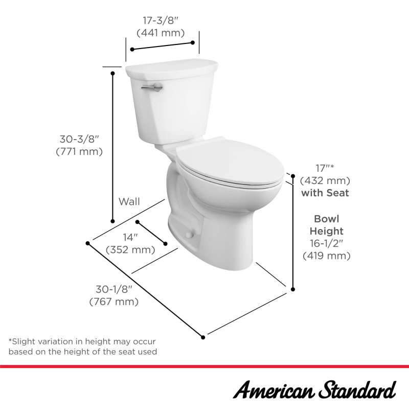 The Cadet PRO Compact Elongated toilet from American Standard gives you the comfort of an elongated toilet, with the space-saving design of a round front. This Chair Height model sits at a chair-like height of 16-1/2inches for a tall toilet that provides added comfort, as well as easier use for individuals with issues such as limited mobility, joint problems, or back problems. The Cadet PRO also features the Cadet Flushing System for an outstanding flush performance that prevents clogs. The EverClean(R) antimicrobial surface protects against mold, mildew, odor- and stain-causing bacteria.