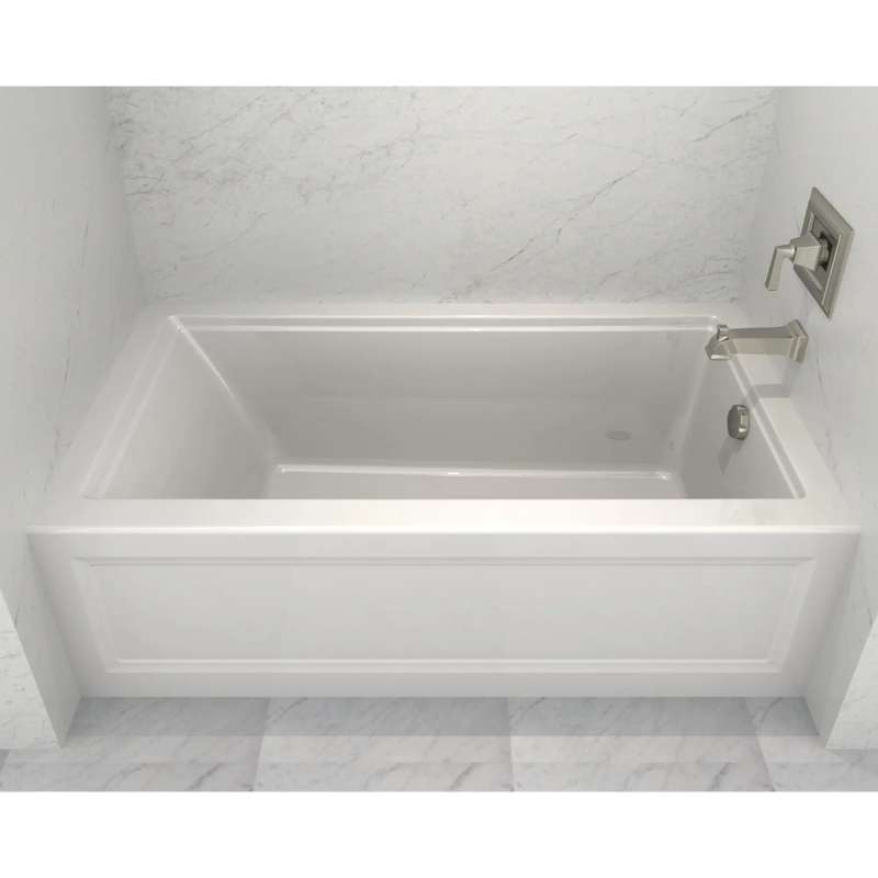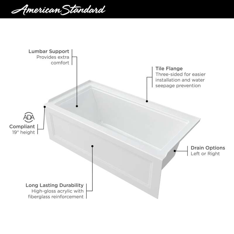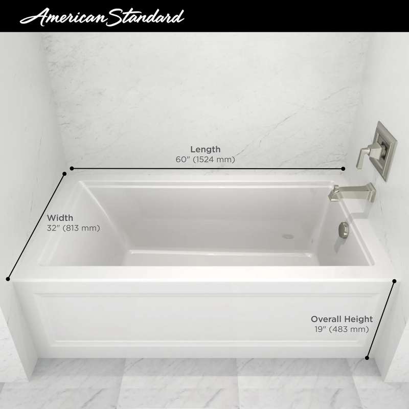 The Town Square S 60 in. x 32 in. Bathtub by American Standard includes a built-in apron that showcases the classic architectural detail of this tub. Crafted from high-gloss acrylic with fiberglass reinforcement, this soaking tub is designed for durability and comfort. A sloped lumbar support enhances relaxation for a more enjoyable bathing experience. As part of the Town Square S bathroom collection, this soaking tub is perfect in traditional to transitional settings.