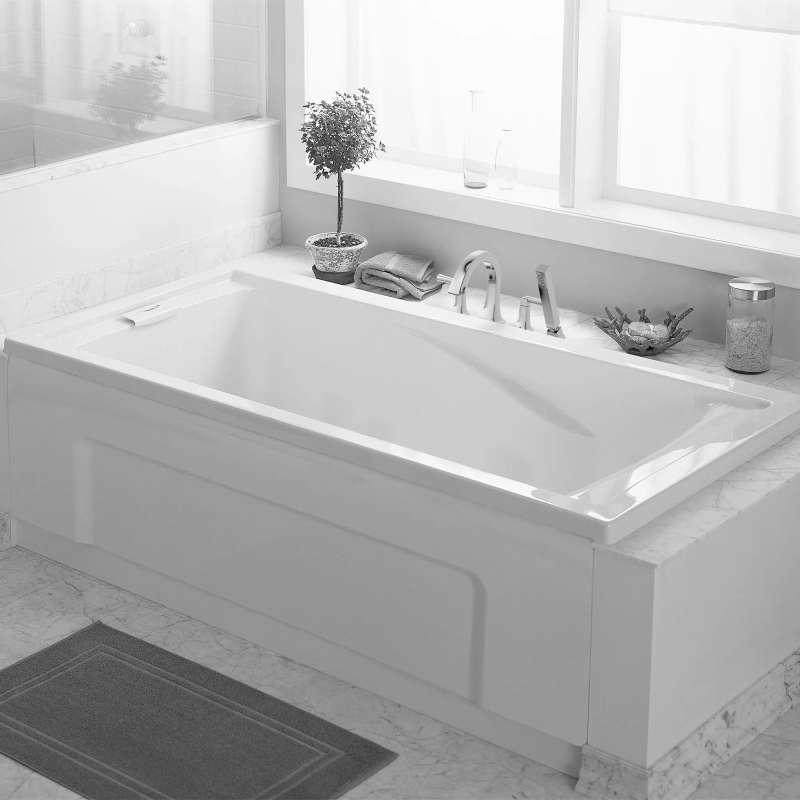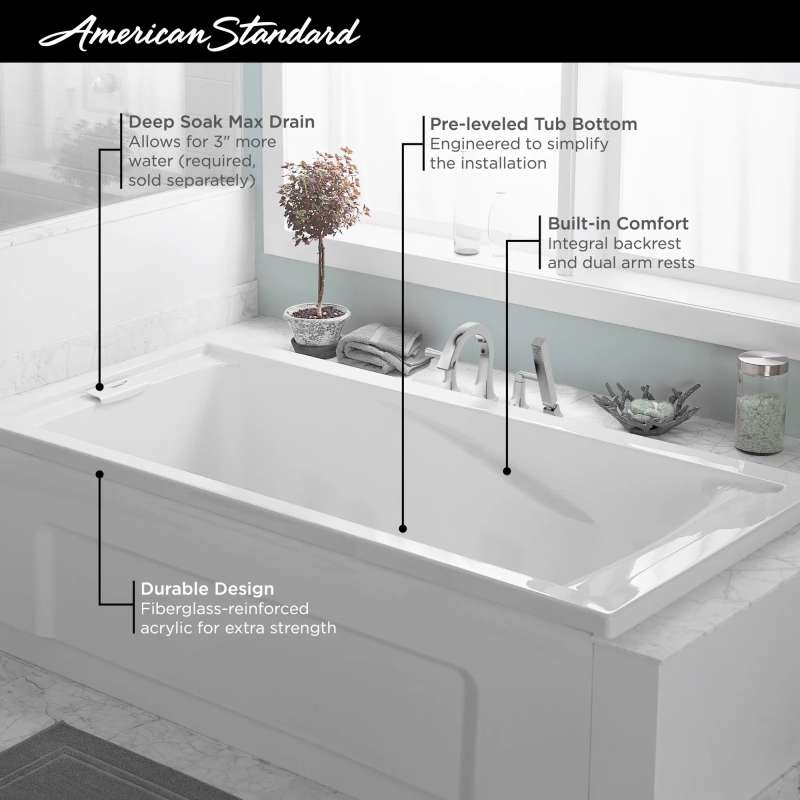 Adapt to greater depths of relaxation. This bathtub from our Evolution(R) Collection goes well with casual bathroom décor. Made from fiberglass-reinforced acrylic for extra strength, plus a backrest and dual armrests for added comfort. Requires a Deep Soak(R) Max Drain that allows 3" more water. Drop-in or alcove installation with an optional apron.