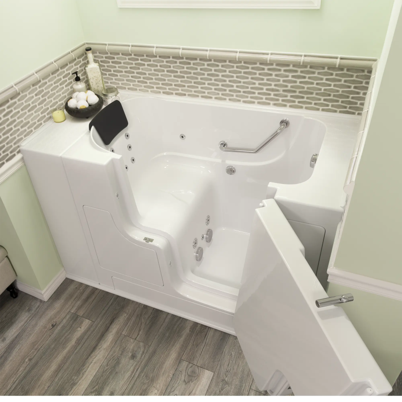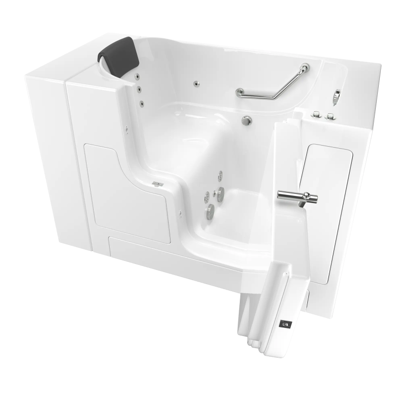 Gelcoat Premium Series 30 in. x 52 in. Outward Opening Door Walk-In Bathtub with Whirlpool Massage system fits in smaller spaces and uses less water-the included Extender Kit makes it easy to retrofit in a standard-size bath space. Fully equipped, the Premium Series offers all the latest in safety and comfort features with the most advanced therapeutic option.