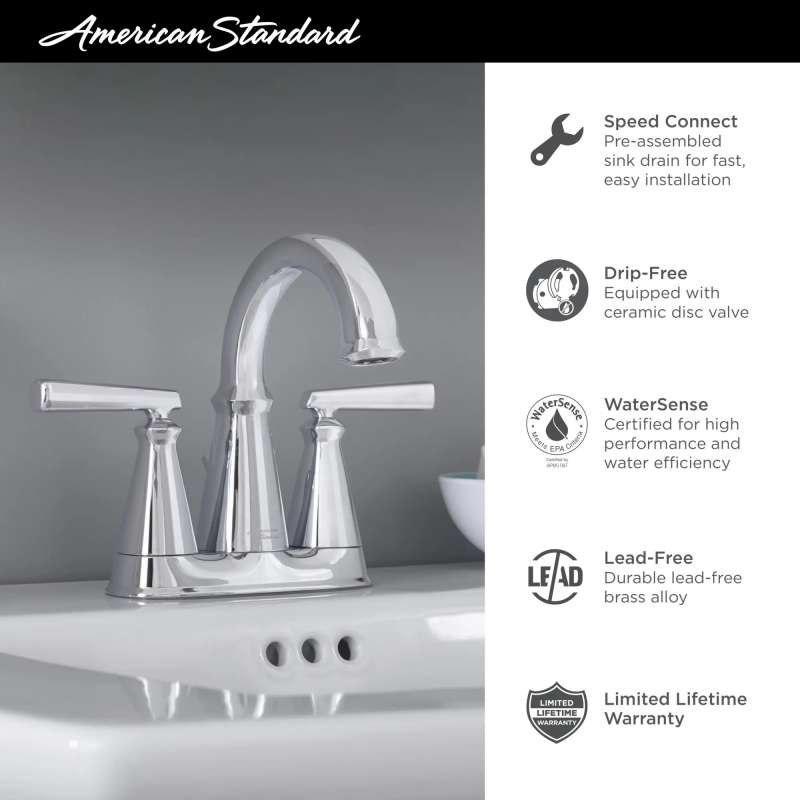 Inspired by transitional décor, the Edgemere Centerset Bathroom Faucet will complement any bathroom from traditional to contemporary style. This centerset faucet is constructed of all metal and includes a SpeedConnect drain for fast and easy installation. It is EPA WaterSense certified to help conserve water without sacrificing performance, and is available in three beautiful finishes.