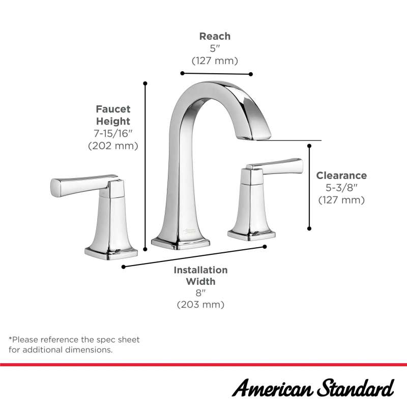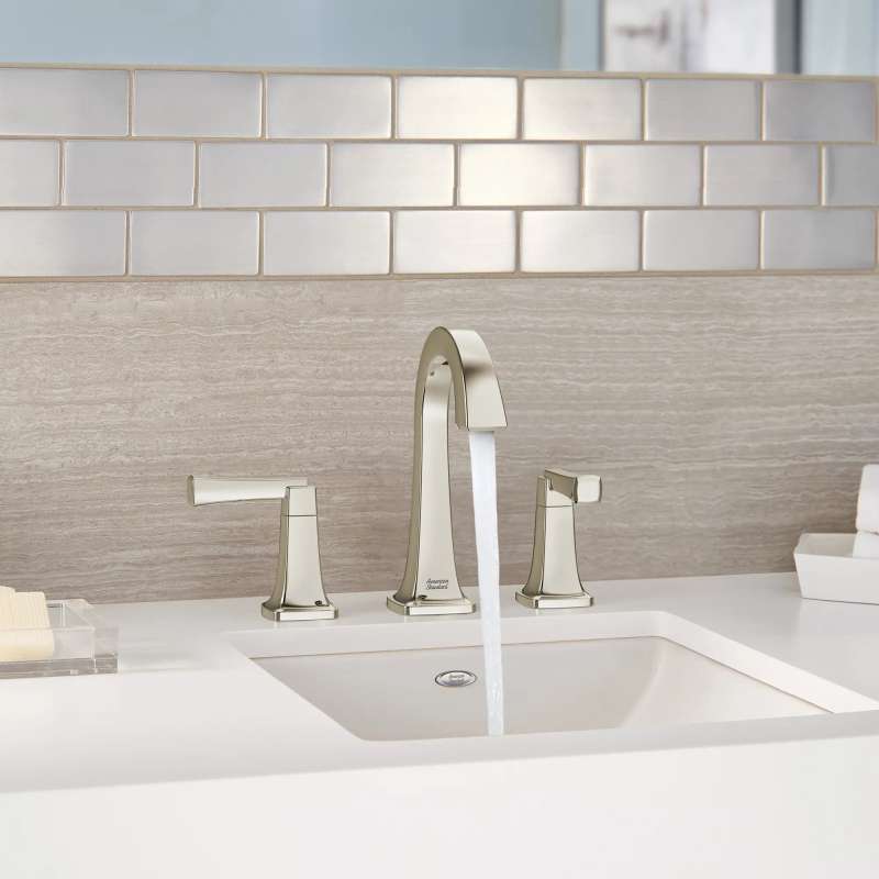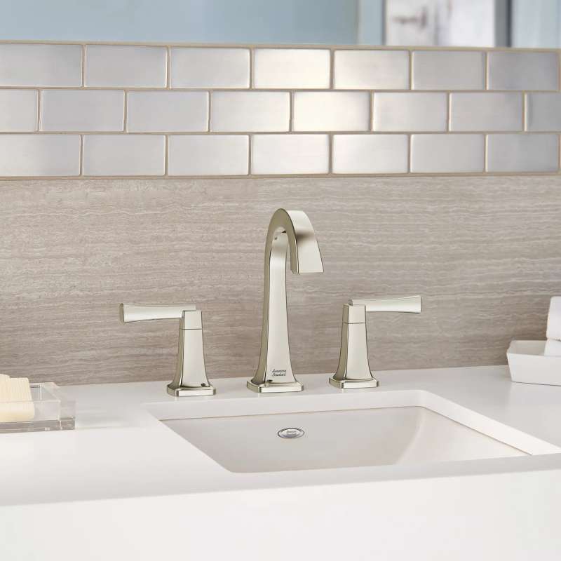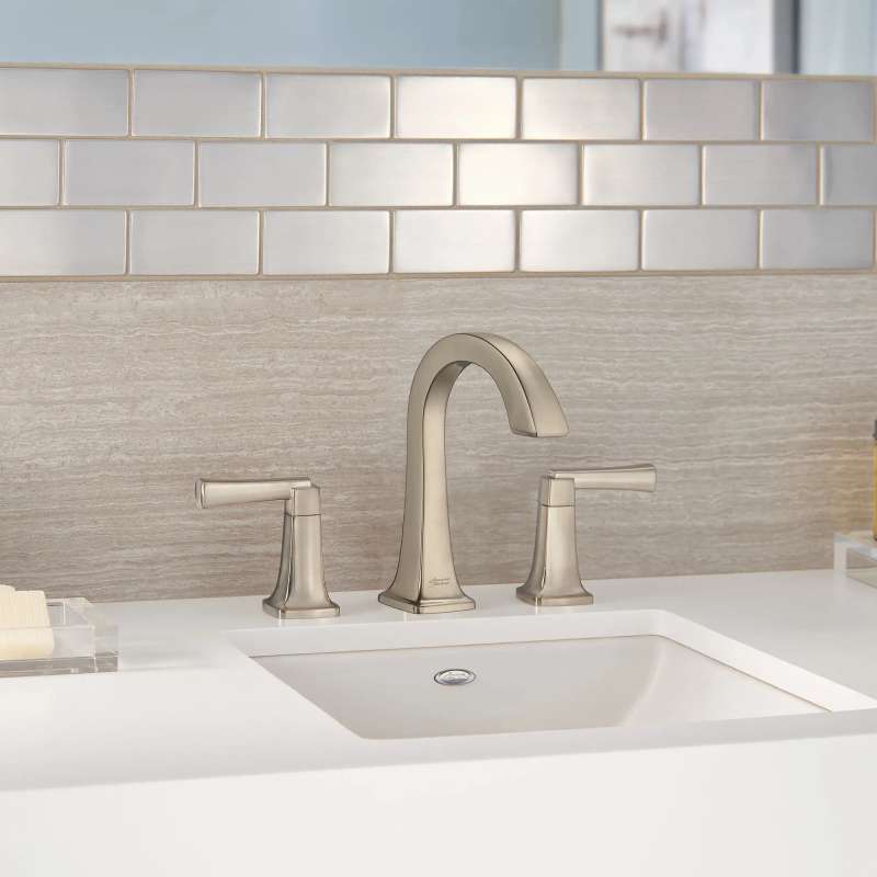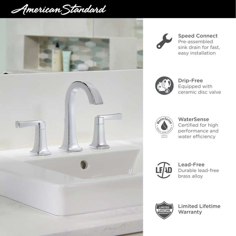 The Townsend 8-In. Widespread 3-Hole Bathroom Sink Faucet from American Standard is an elegant design with a high-arc spout. Designed for durability, this metal bathroom faucet features two ADA-compliant metal lever handles and a push pop-up drain that is simple to use and quick to install, requiring fewer parts than a standard drain. The Townsend bathroom sink faucet is available in an array of beautiful, on-trend finishes to complement any bathroom style.