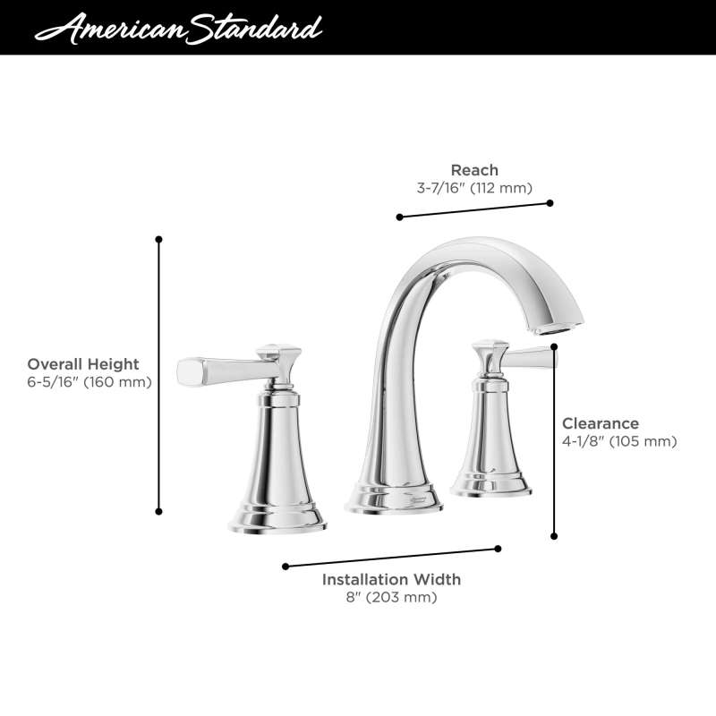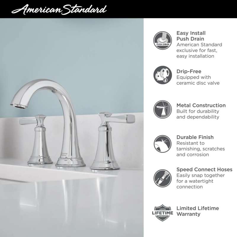 The traditional design, enhanced by classic details, makes the Glenmere Bathroom Faucet from American Standard an ideal choice in a bathroom that will stand the test of time. Engineered with smooth, sturdy handle construction, drip-free performance, and a durable metal drain for lasting reliability. These hallmarks of an American Standard faucet give the Glenmere everyday practicality and enduring beauty for today's bathroom.