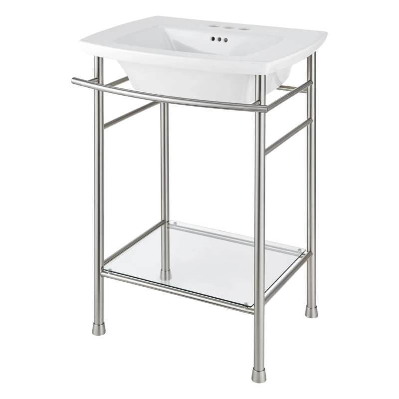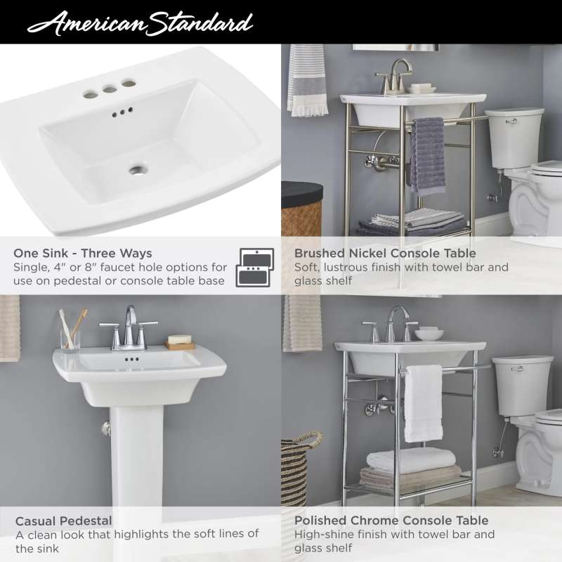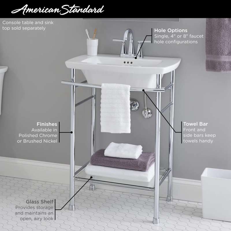 The Edgemere Console Table Legs from American Standard features a transitional style, with a modern-day twist that will fit perfectly in your bathroom. Made of durable, quality metal, the Edgemere Console Table Legs can be paired with the Edgemere Console Sink Top for a complete, perfectly coordinated set. Available in our beautiful Polished Chrome and Brushed Nickel finishes.