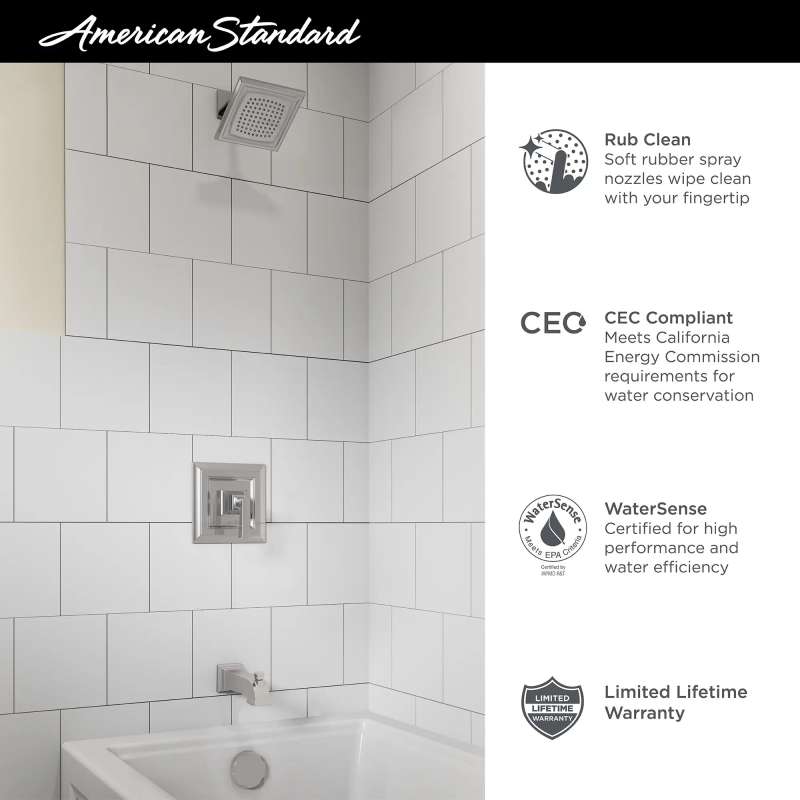 Add an element of design drama to your bathroom with Town Square S. Rich, architectural lines reflect traditional elegance and superior craftsmanship engineered for today's home. It's equipped with dependable, double ceramic pressure balance technology for consistent water temperature, anti-scald protection, and smooth, flawless operation. Designed to use 28% less water than standard showerheads without sacrificing performance, features tarnish- and scratch-resistant finishes to coordinate with the entire collection. Requires Flash Shower Rough-in Valve, sold separately.