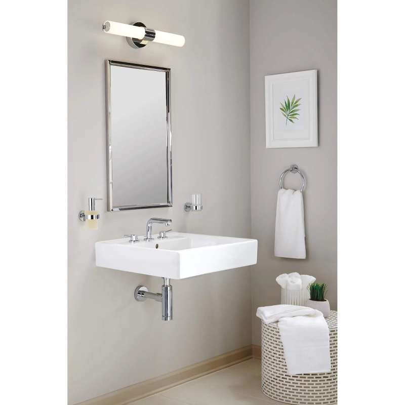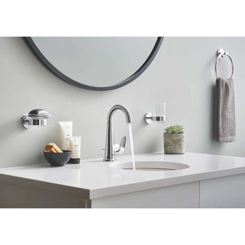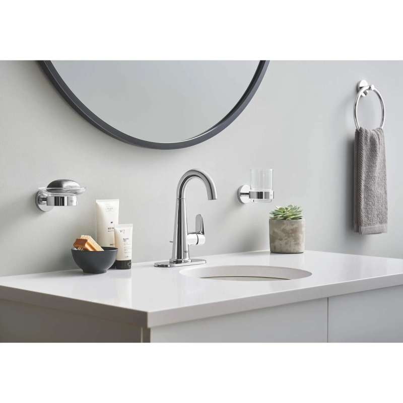 Clean, simple lines make the Essentials Glass with Holder the perfect complement for any bathroom design. Holder is made of metal with a tarnish- and scratch-resistant finish for durability and lasting luster.