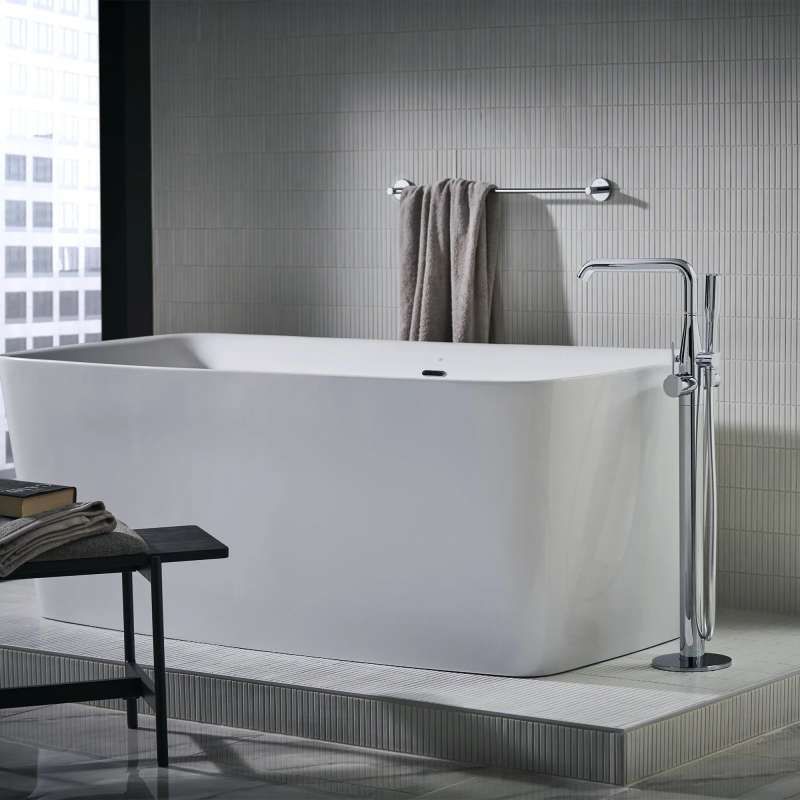 Sleek, sophisticated and available in an array of exquisite finishes, the GROHE Essence Floor Standing Tub Filler with Hand Shower adds a distinctive touch to your freestanding bathtub. Engineered with impressive features for today's well-appointed home, the Essence Freestanding Tub Filler ensures superior performance with smooth, GROHE SilkMove handle operation, lasting beauty with the durable GROHE StarLight finish, and a relaxed experience with the Euphoria Stick Hand Shower featuring GROHE DreamSpray. This contemporary tub filler embodies all the elements of precision craftsmanship and design excellence that have made GROHE the choice for discerning homeowners.