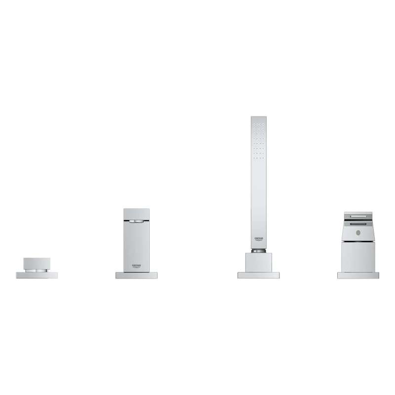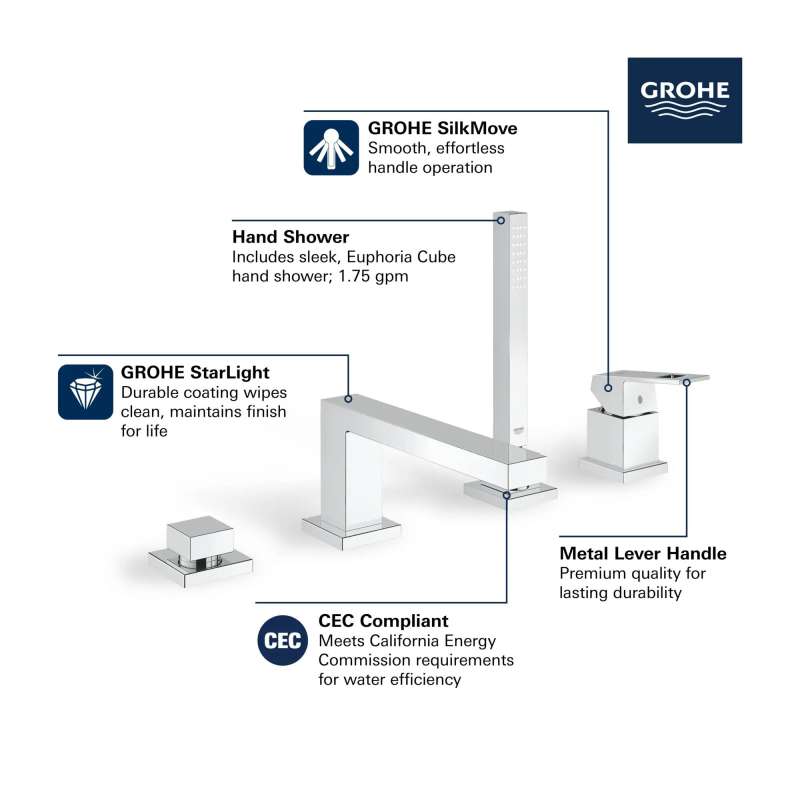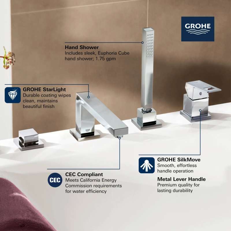 The GROHE Eurocube 4-Hole Single-Handle Deck Mount Roman Tub Faucet combines clean geometric lines with superior performance for the well-appointed bathroom. Eurocube is equipped with a sleek hand shower and tub filler, both precision crafted for superior style and performance. Featuring GROHE SilkMove to ensure smooth, precise water control.