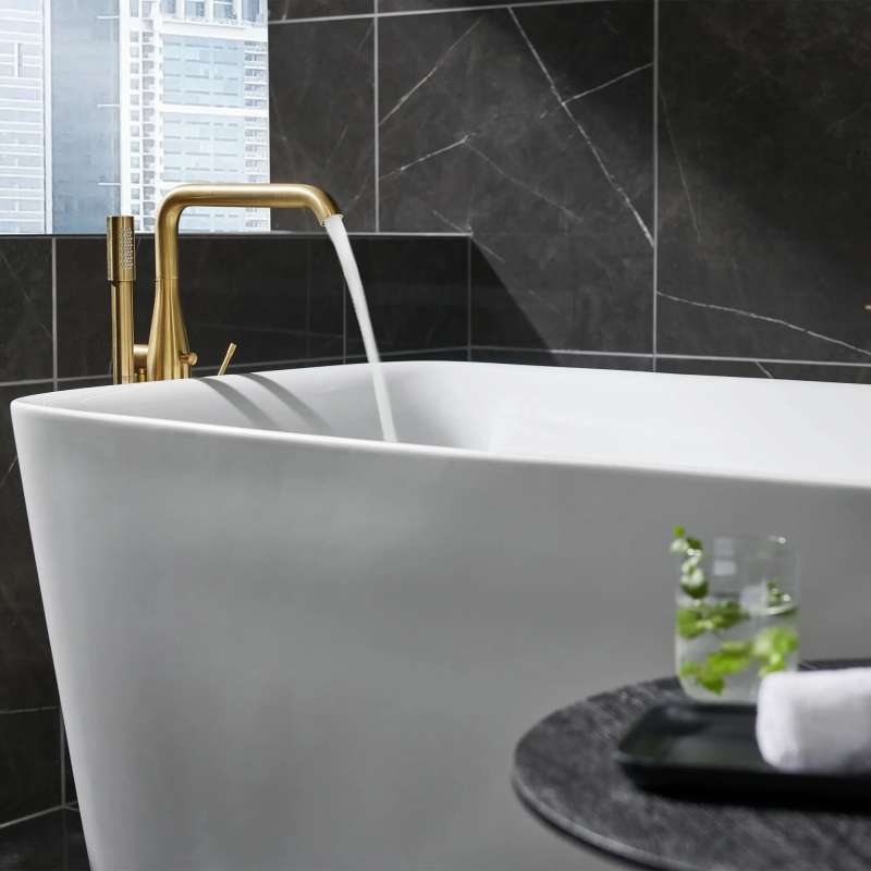 Sleek, sophisticated and available in an array of exquisite finishes, the GROHE Essence Floor Standing Tub Filler with Hand Shower adds a distinctive touch to your freestanding bathtub. Engineered with impressive features for today's well-appointed home, the Essence Freestanding Tub Filler ensures superior performance with smooth, GROHE SilkMove handle operation, lasting beauty with the durable GROHE StarLight finish, and a relaxed experience with the Euphoria Stick Hand Shower featuring GROHE DreamSpray. This contemporary tub filler embodies all the elements of precision craftsmanship and design excellence that have made GROHE the choice for discerning homeowners.