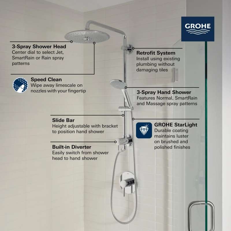 The GROHE Retro-Fit Euphoria 260 Shower System transforms a standard shower into a multifunctional, luxury shower using existing plumbing and eliminating the need for a total renovation. This complete shower system is quick to install and results in a bathroom update that delivers the superior performance and showering pleasure that has made GROHE the choice of discerning homeowners.