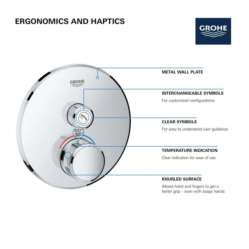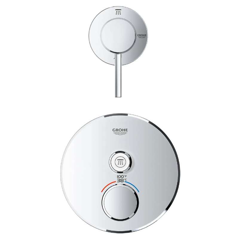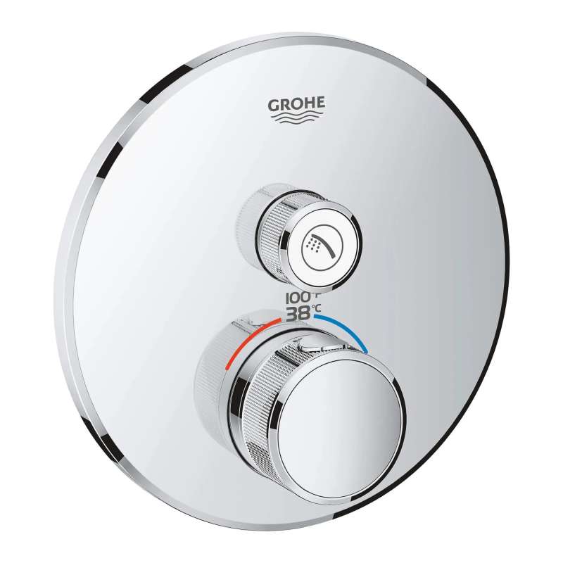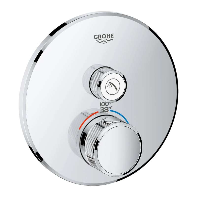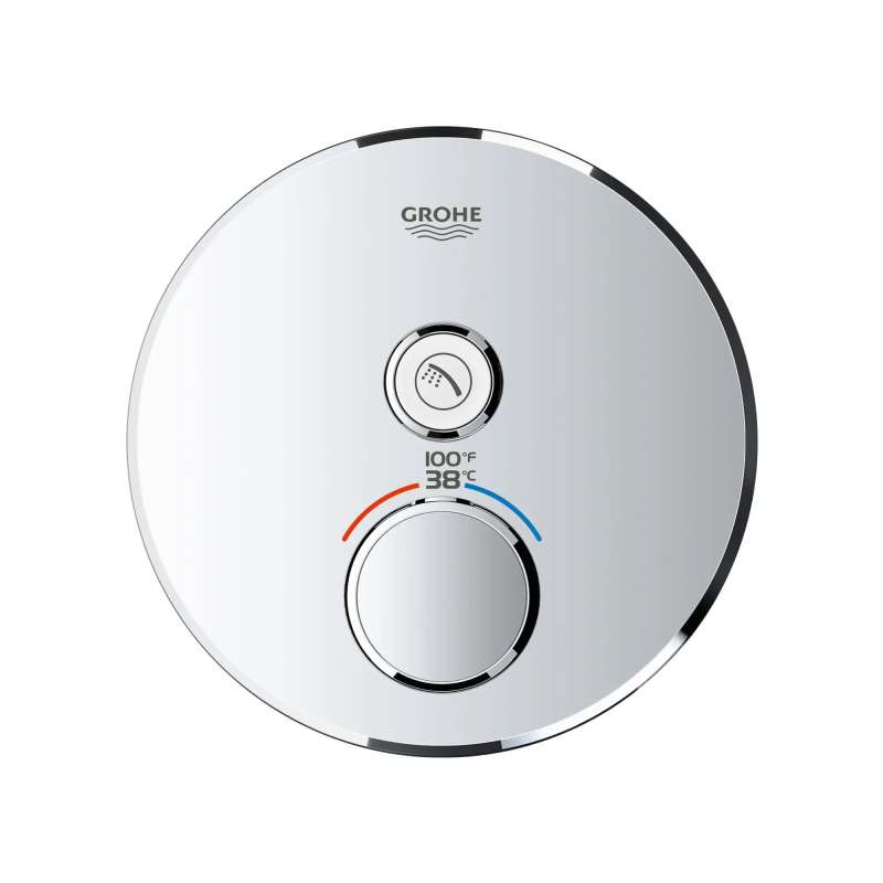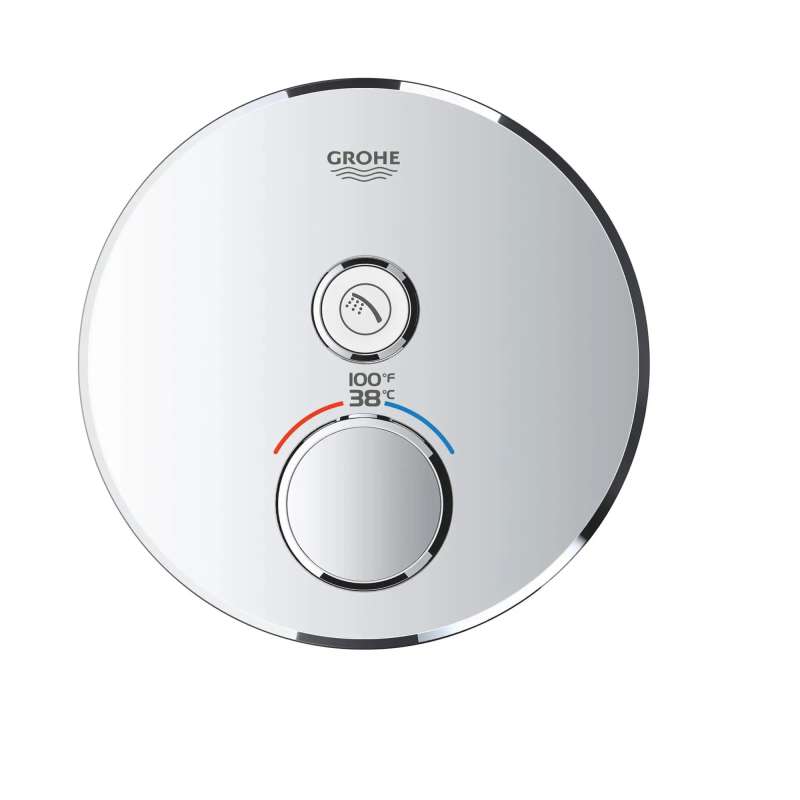 The innovative GrohTherm SmartControl Single Function Thermostatic Valve Trim is a clean, minimalist design that allows you to control your shower with push-turn ease. Integrated GROHE TurboStat maintains a consistent water temperature for a more enjoyable experience. The GROHE SafeStop override button allows you to set a maximum temperature of 100 deg F/38 deg C to prevent scalding, ensuring safety for the whole family. Water-saving GROHE EcoJoy technology gives you the option of a reduced flow rate with no compromise on performance.