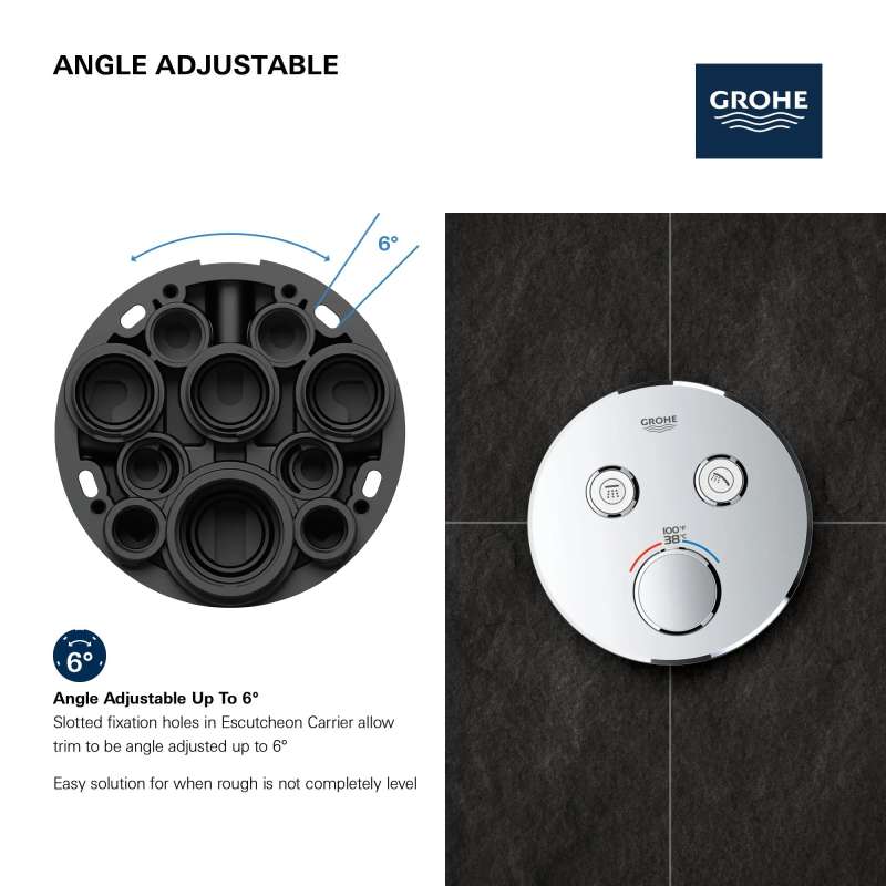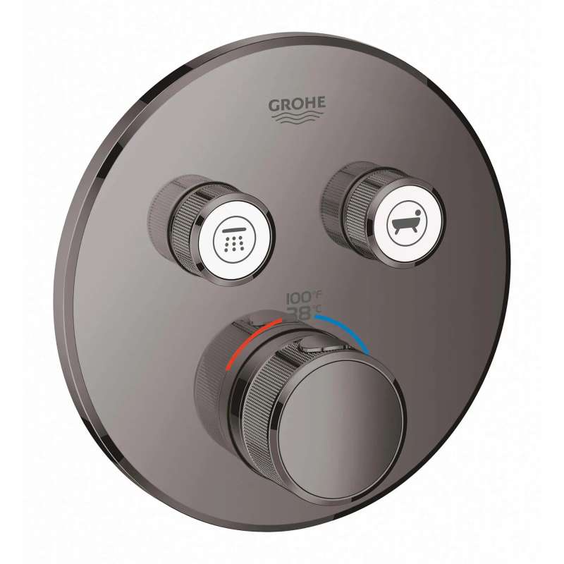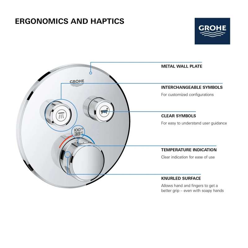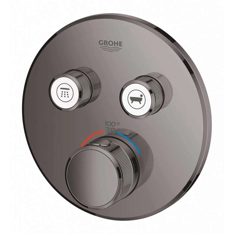 The innovative GrohTherm SmartControl Dual Function Thermostatic Valve Trim has a clean, minimalist design that allows you to select your desired water source and adjust the volume at the push-turn of a button. Alternate between water sources or enjoy both simultaneously. Integrated GROHE TurboStat maintains a consistent water temperature for a more enjoyable experience. The GROHE SafeStop override button allows you to set a maximum temperature of 100 deg F/38 deg C to prevent scalding, ensuring safety for the whole family. Water-saving GROHE EcoJoy technology gives you the option of a reduced flow rate with no compromise on performance.