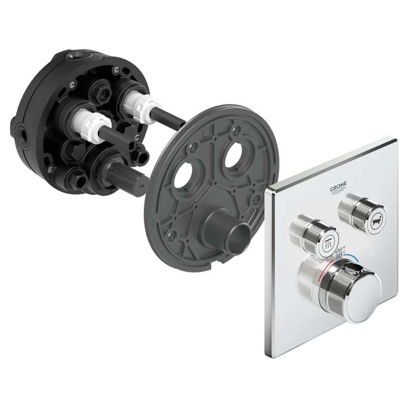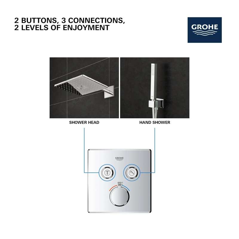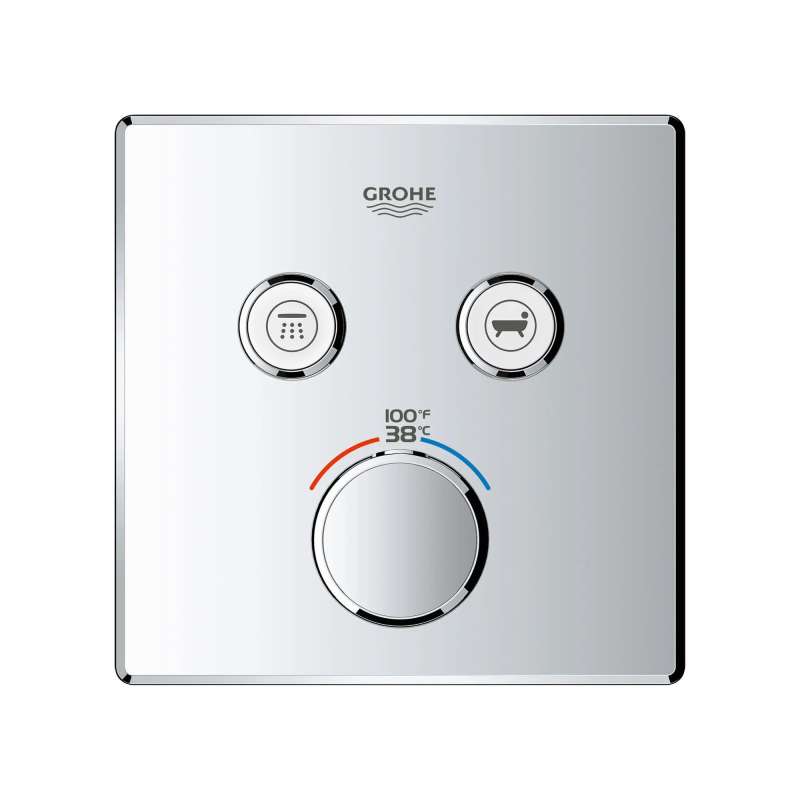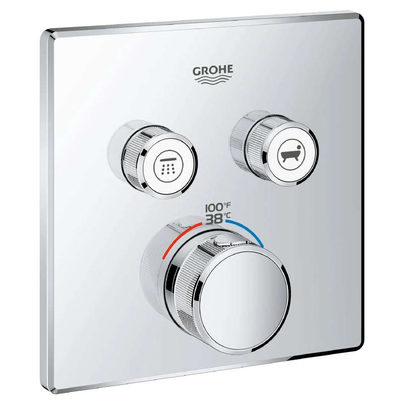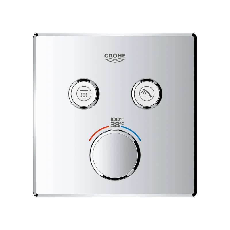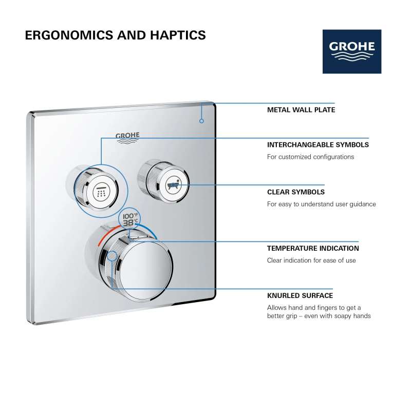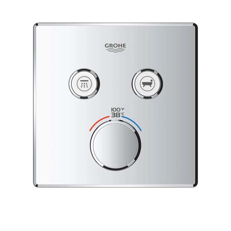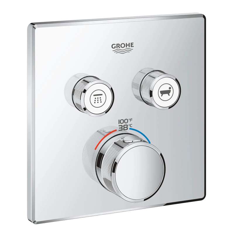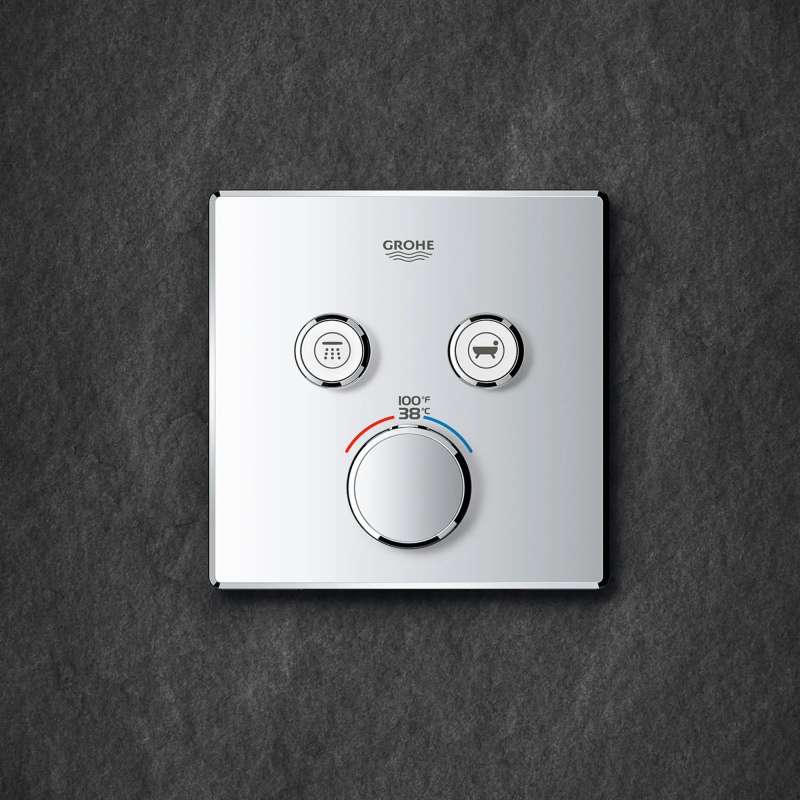 The Grohtherm SmartControl Dual Function Thermostatic Trim from GROHE is a slim, contemporary design that will enhance any bathroom and make showering more enjoyable. Innovative and intuitive to use, the dual-function SmartControl lets you adjust water volume from two spray sources with the simple push-turn of a button. Easily switch between sprays, experience each spray individually or enjoy both at the same time. It features integrated GROHE Turbostat technology to keep water temperature consistent for the duration of your shower, preventing any unpleasant hot/cold fluctuations. Please note that this product must be installed in combination with the GROHE Rapido SmartBox (35601000).