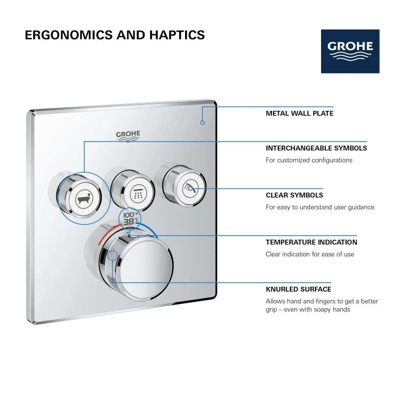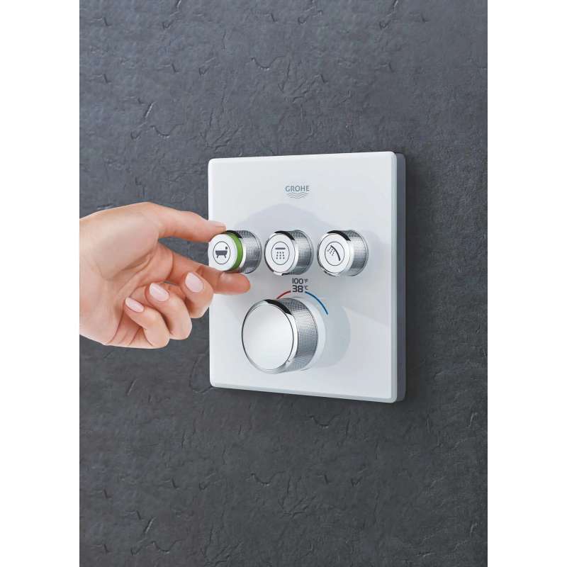 Grohtherm SmartControl - break the mold with this chic, slim thermostat offering total flexibility Choose a thermostat that is as flexible as possible for your most enjoyable shower or bath ever. Packed with useful features, the Grohtherm SmartControl concealed thermostat features a minimalist design and stylish Moon White that will enhance any modern bathroom. The innovative SmartControl technology allows you to select your desired spray source and adjust the water volume at the push-turn of a button. The three valves offer total flexibility, whatever your shower set up - you can control, switch between or even combine different spray patterns and water outlets - perfect for spaces where you want to have hand, head and side showers, as well as a bath. Integrated GROHE Turbostat technology prevents any unpleasant temperature fluctuations. GROHE EasyLogic markings and textured buttons with exchangeable symbols make it easy and intuitive to use. Family-friendly, the GROHE SafeStop override button allows you to set a maximum temperature of 100 deg F/38 deg C to prevent scalding. Water-saving GROHE EcoJoy technology gives you the option of a reduced flow rate with no compromise on enjoyment. Thanks to the GROHE QuickFix system it's Swift and straightforward to install. The slim profile makes it easy to keep clean, and the chic, durable GROHE StarLight Moon finish will look pristine for years to come. With a slim, round design perfect for that minimalist, streamlined look, this product is bound to enhance your bathroom scheme. Please note that this product must be installed in combination with the GROHE Rapido SmartBox (35601000).