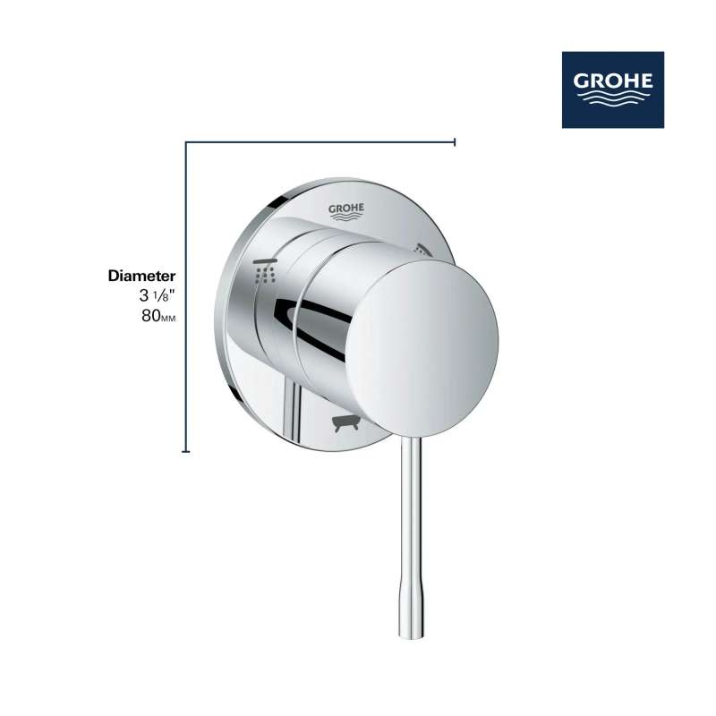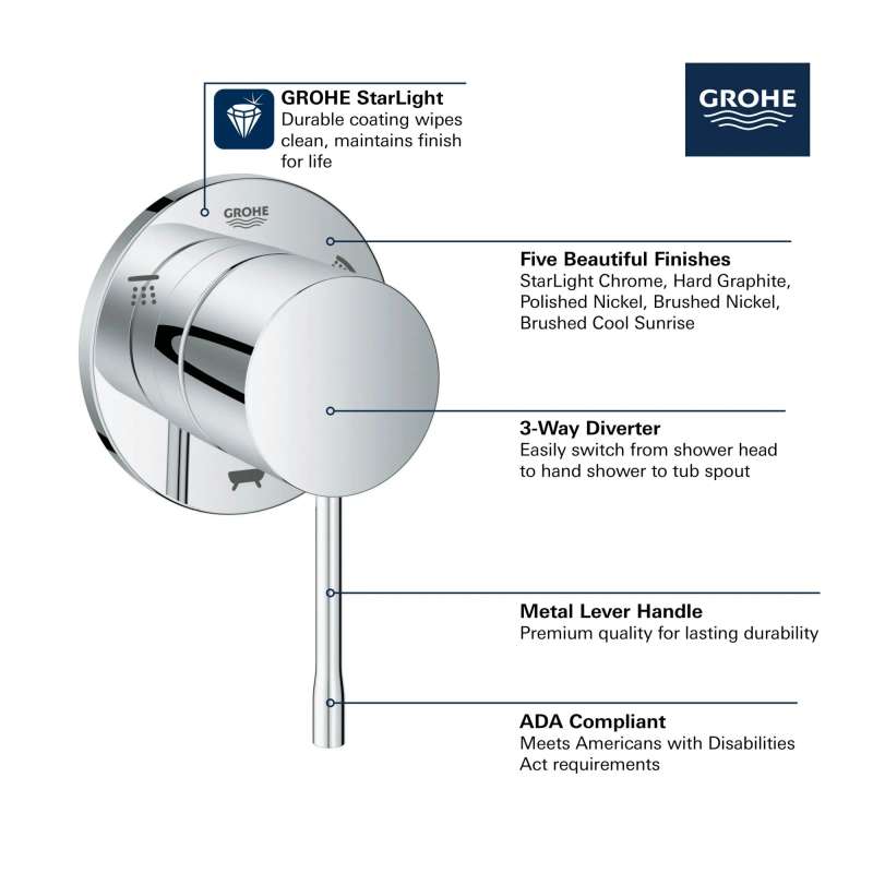 Sleek and sophisticated, the GROHE Essence 3-Way Diverter Trim adds superior functionality and contemporary style to your bathroom. Engineered for smooth, precision operation, switching from shower head to hand shower to tub spout has never been easier.