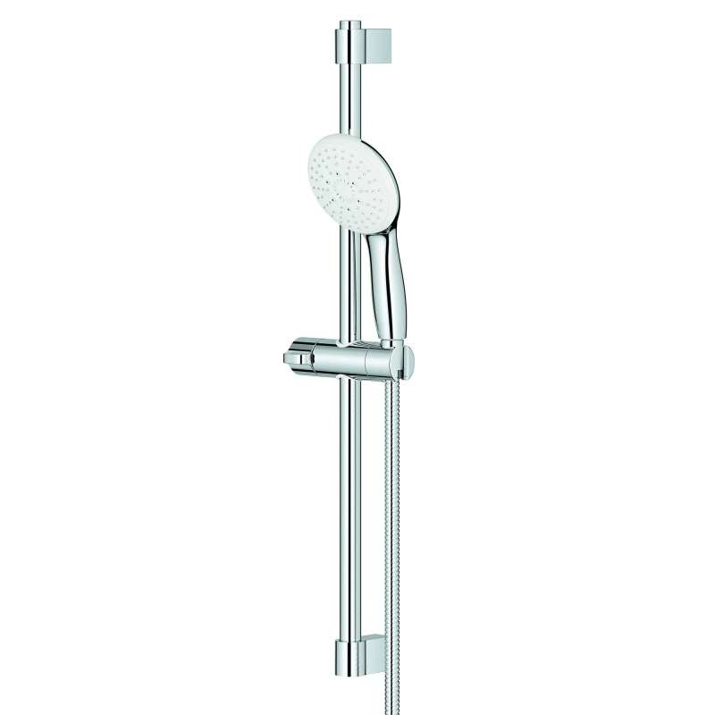 The Tempesta 110 Round 24-inch Shower Rail Set from GROHE features the Tempesta 110 Round Hand Shower with innovative SmartSwitch dial that makes it easy to change from a soothing Rain spray to a powerful Jet spray or a relaxing Massage spray. The 4 1/4-inch spray face offers generous coverage. Designed and engineered in Germany, this contemporary shower rail set also includes a sleek, 24-inch (600 mm) rail with gliding hand shower holder, metal shower hose, and adjustable upper bracket to cover existing holes when installing.