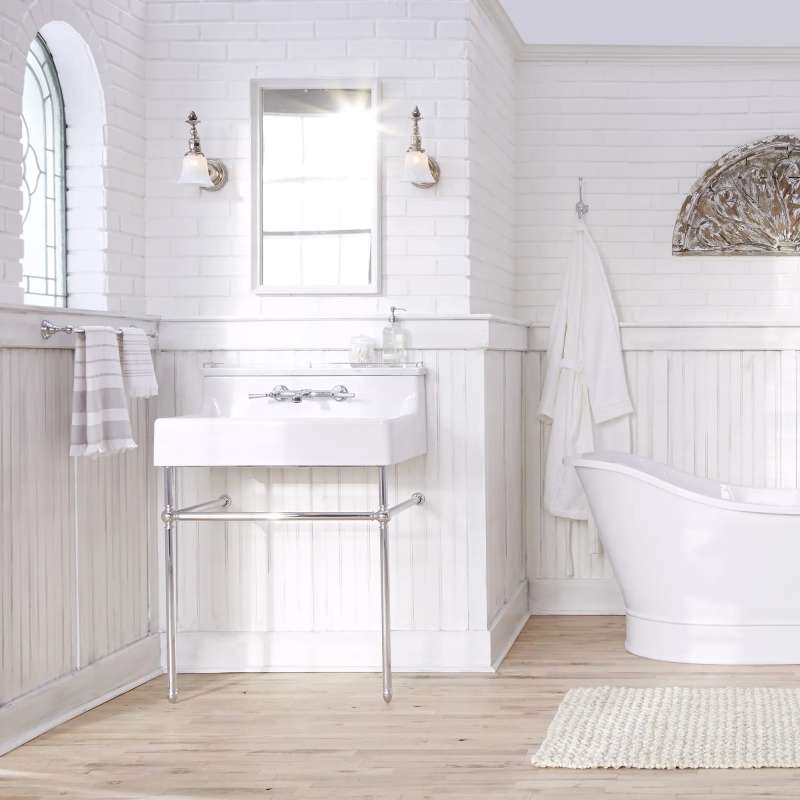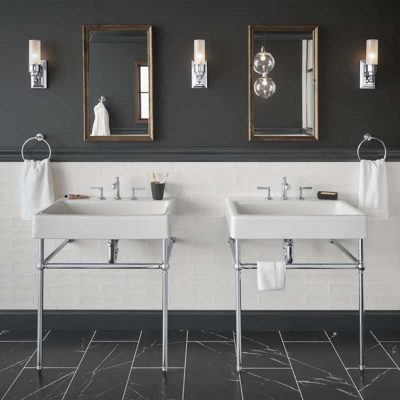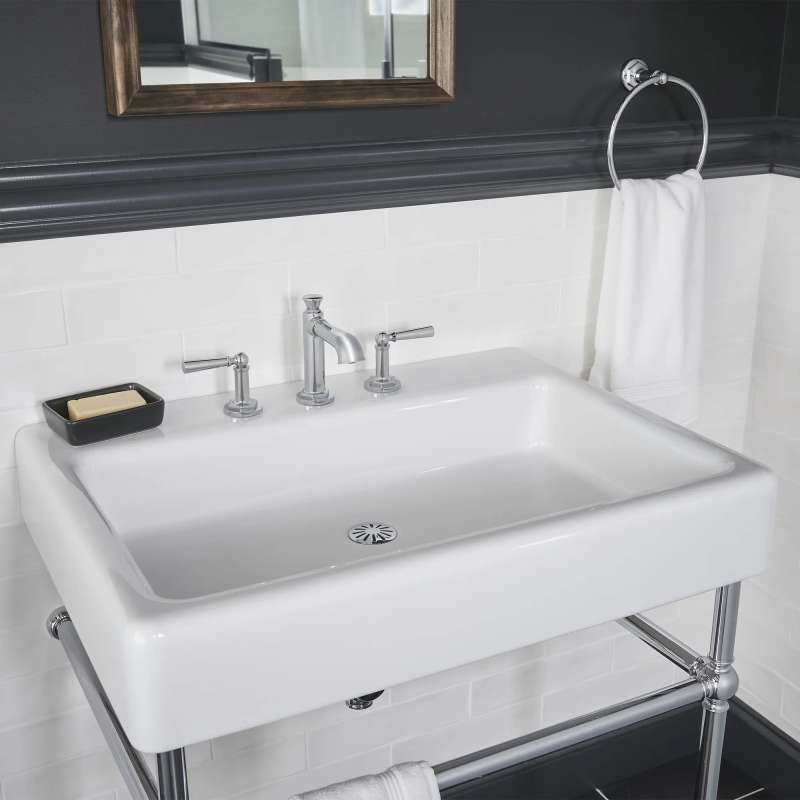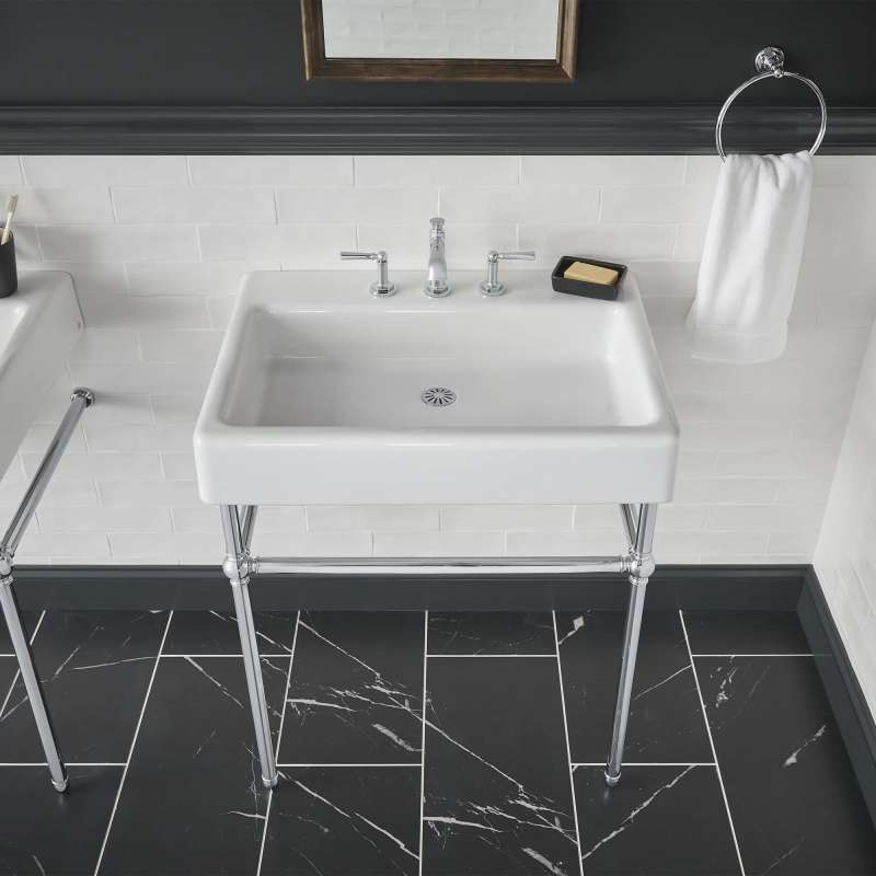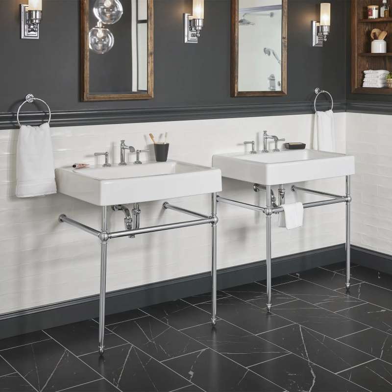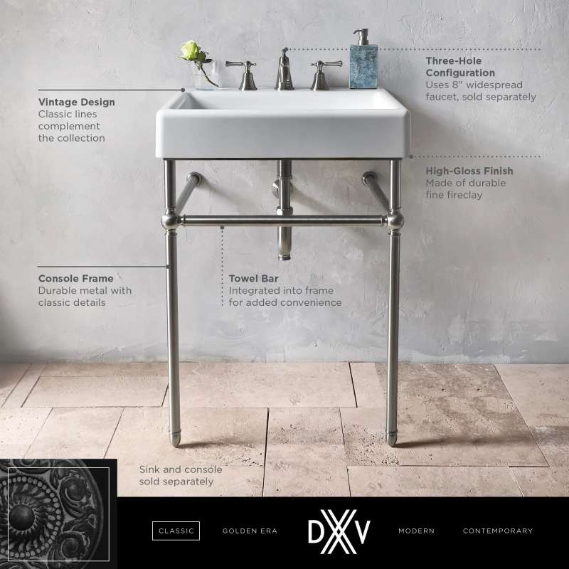 The Oak Hill Metal Bathroom Console from DXV reflects the charm and appeal of the traditional farmhouse aesthetic. Understated styling is accented with meticulous details for a clean, classic look. This exquisite design doubles in functionality with side and front bars to conveniently accommodate towels. Part of the Oak Hill Collection, a complete, curated bathroom suite for the well-appointed home.