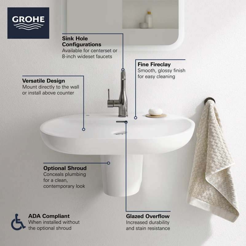 Reflecting the exceptional character of every GROHE design, the Essence Wall-Hung Bathroom Sink is defined by soft curves and timeless luxury. Equally beautiful in an above-counter setting, the Essence sink pairs perfectly with the Essence toilet (sold separately) and specially selected GROHE faucets (sold separately). With GROHE, coordinating the elements of an elegant bathroom is an effortless way to create a space that fosters harmony and relaxation.