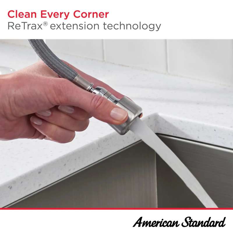 Whether at home in an entertaining area or secondary kitchen sink, the Studio S Pull-Down Single-Spray Single Handle Bar Faucet from American Standard is the ideal combination of presence and performance. This contemporary bar faucet features a pull-down spray head with single-function aerated spray, and smooth extension and retraction during use. Unique raised handle with one-piece lever provides drip-free performance while adding distinction to your kitchen design.