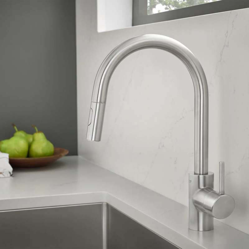 The GROHE Concetto Dual Spray Pull-Down Kitchen Faucet is a single-handle faucet engineered for superior performance. Convenient pull-down sprayer easily toggles between regular water flow and spray for maximum versatility. Meticulously crafted with a high, swivel spout, this contemporary kitchen faucet makes it easy to fill large pots, access the entire sink and complete kitchen tasks quickly. Sleek lever handle offers precise control of water pressure and temperature.