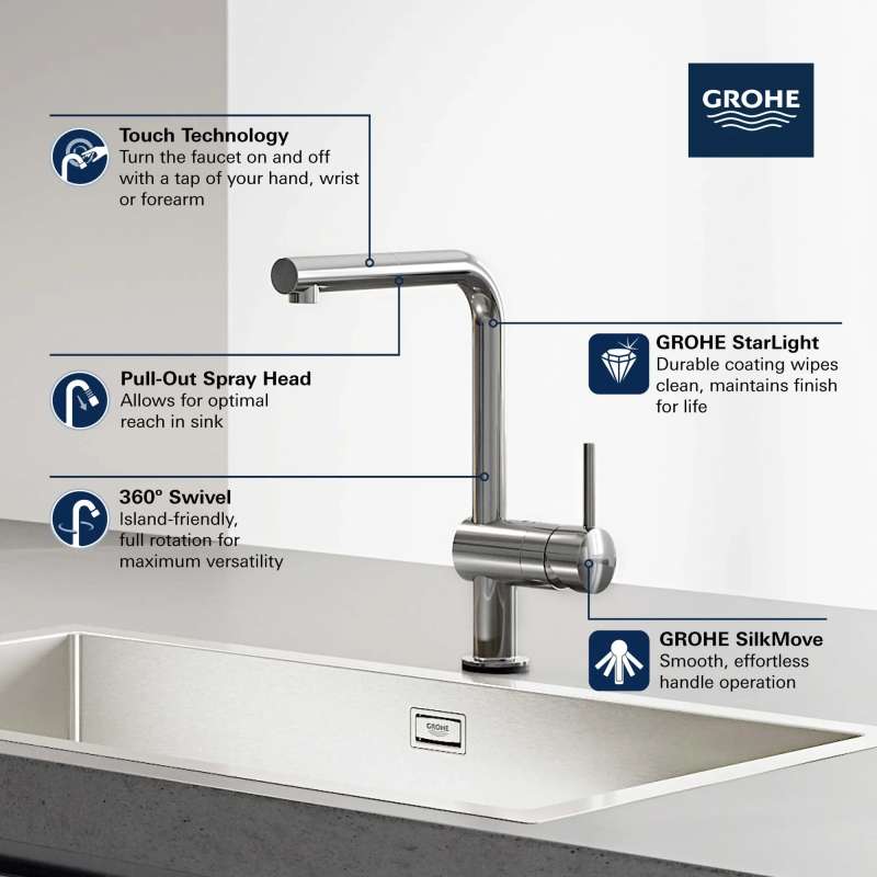 The Minta Touch Pull-Out Single Spray Kitchen Faucet is a single-handle faucet that offers the convenience of touch activation. Simply touch the spout and the water turns on and off automatically, keeping it clean and hygienic no matter the task. This versatile, single-hole kitchen faucet combines the efficiency of touch technology with the exactness of a manual lever handle equipped with GROHE SilkMove for smooth, precise control. Featuring a 360 deg swivel spout and single-spray pull-out spray head, access to every area, in and around the sink, is easy and convenient.