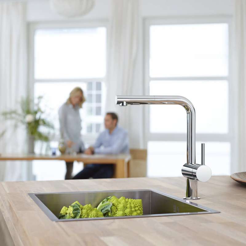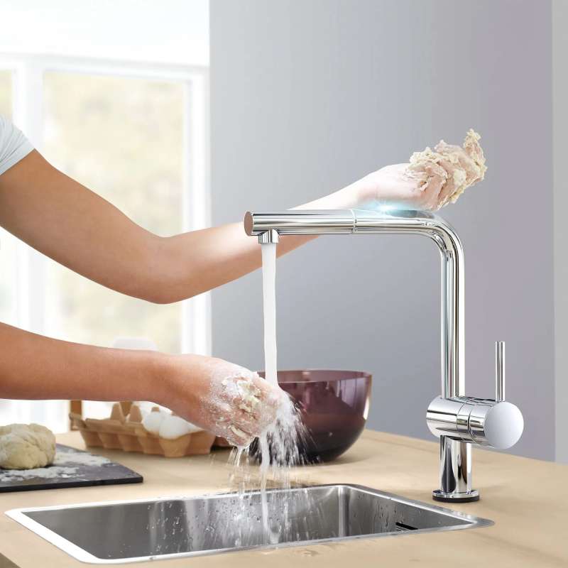 Thoughtfully designed to impress and perform, the GROHE Minta Single-Handle Pull-Out Dual-Spray Kitchen Faucet is sleek and modern. Equipped with renowned GROHE technology including GROHE SilkMove for smooth, precise handle movement and Easy Docking Function for easy retraction and docking of the spray head. Dual spray functions enable easy switching from regular stream for filling pots to spray for rinsing vegetables or cleaning the sink with ease.