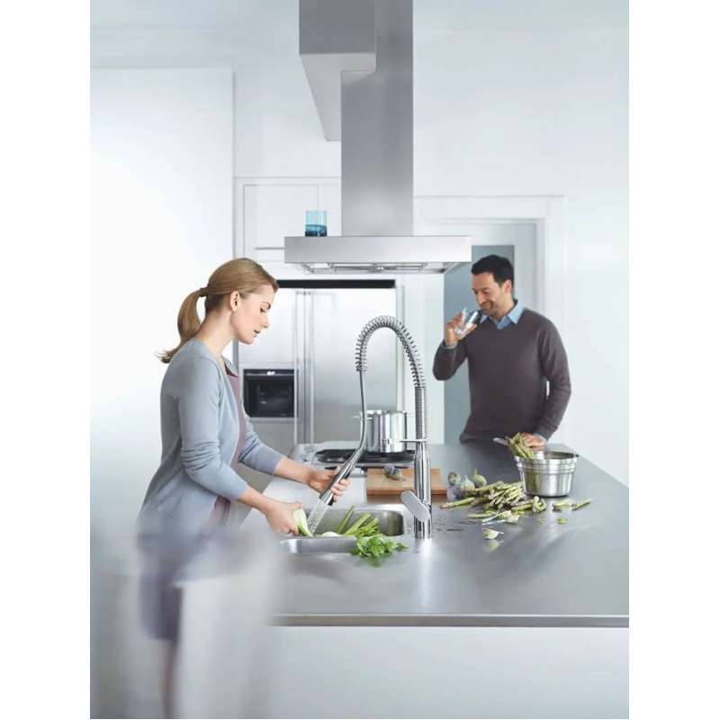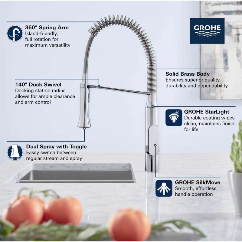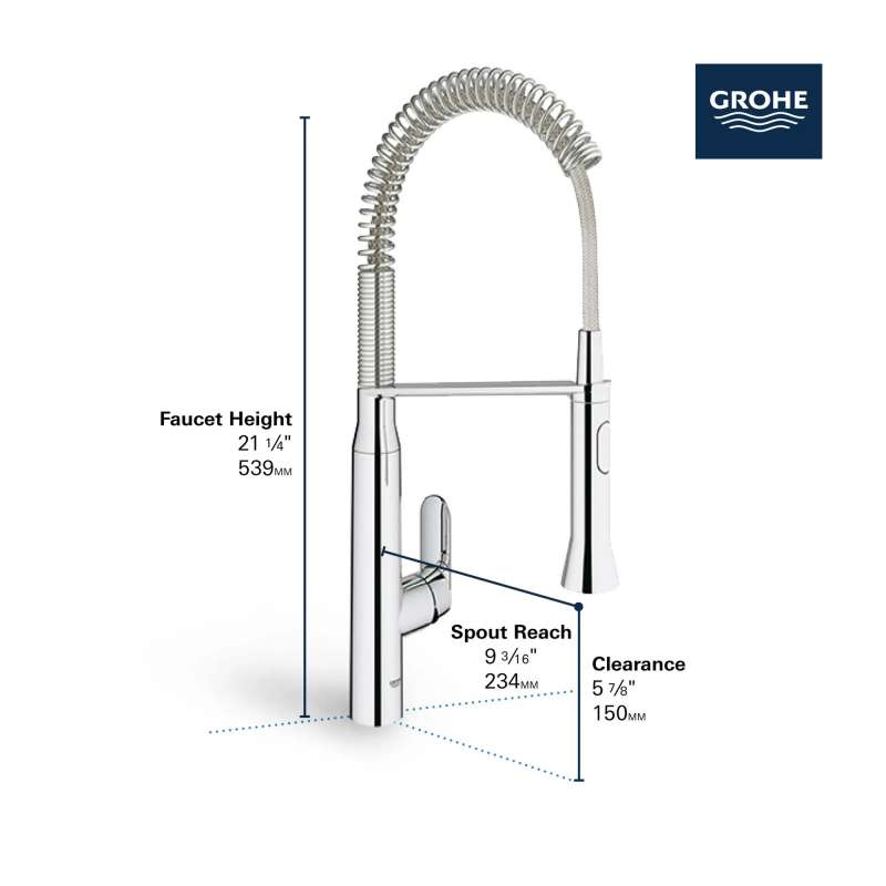 The K7 Single-Handle Semi-Pro Dual Spray Kitchen Faucet from GROHE is durable, dependable, and designed to give your kitchen a professional look without overpowering. Spring arm provides an extensive operating radius within the sink and swivels 360 deg for added versatility in a center island. Medium high spout and dual spray functions make every kitchen task easier, from filling pots to cleaning the sink and rinsing vegetables.