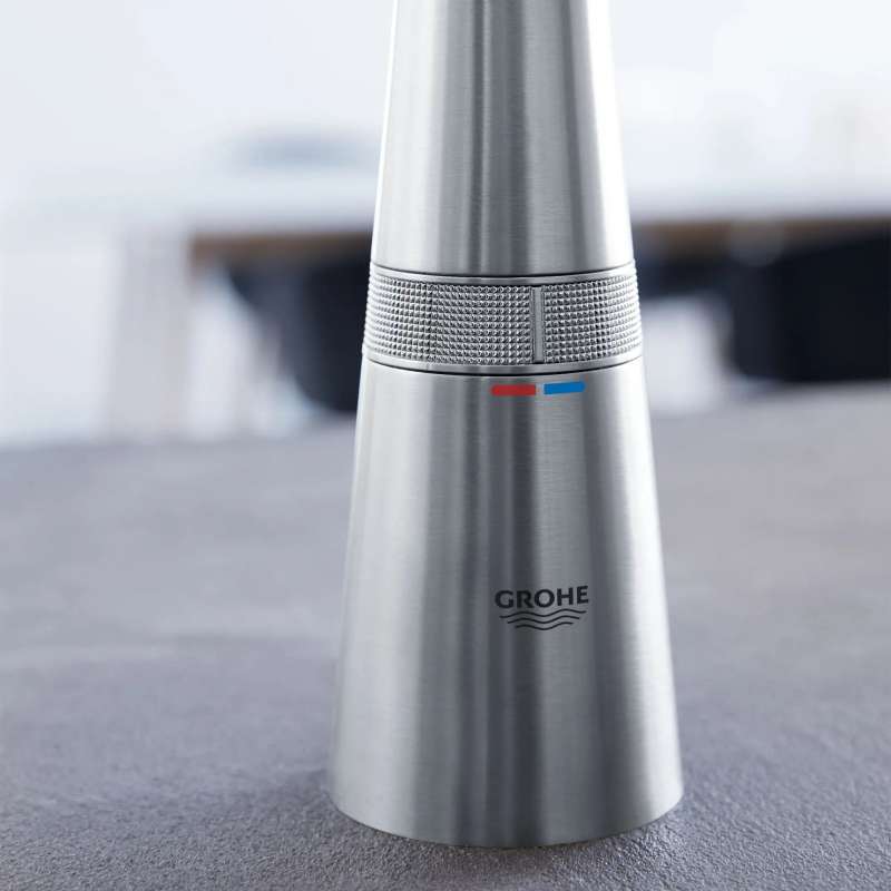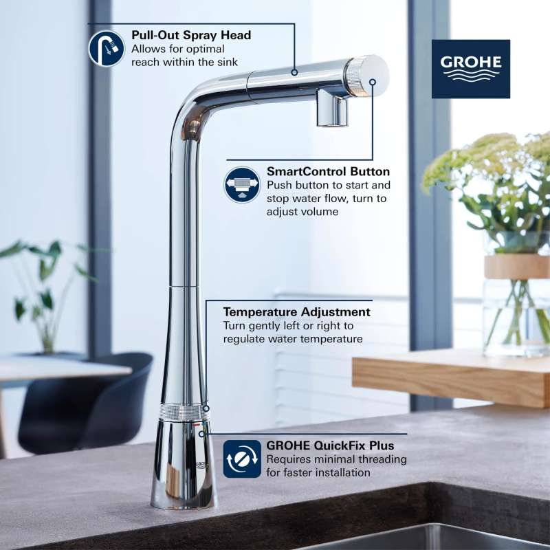 • PUSH-BUTTON ON/OFF: Exclusive GROHE SmartControl is an innovative kitchen faucet featuring a push-button tip on the spout to control on/off; turn to adjust water volume