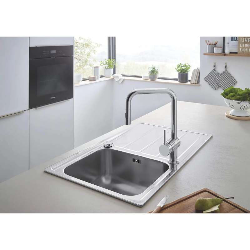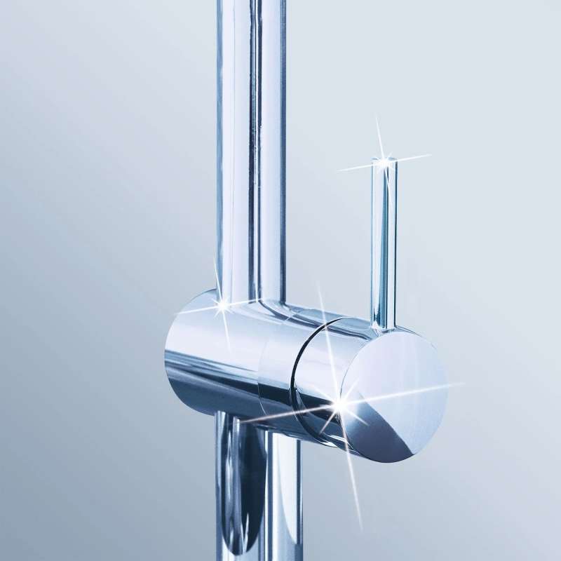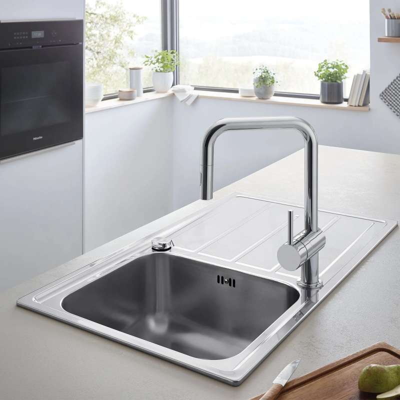 The GROHE Minta Dual-Spray Pull-Down Kitchen Faucet is a contemporary single-handle faucet with impressive U-shaped spout. Convenient pull-down spray head easily toggles between regular water flow and spray for maximum versatility from filling pots to rinsing the sink. This single-hole kitchen faucet is meticulously crafted with a 360 deg swivel spout and lever handle that offers precise control of water pressure and temperature.