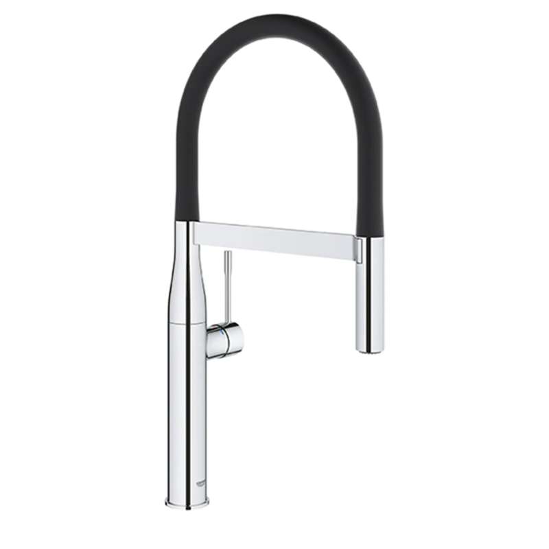 Reflecting minimalist beauty in its purest form, the GROHE Essence New Semi-Pro Single-Handle Dual Spray Kitchen Faucet is a natural choice for today's cosmopolitan kitchen. This elegant single-hole kitchen faucet features a flexible, high-arched black hose spout with integrated spring to reach every corner of the sink. The dual function spray head with toggle function offers seamless switching between spray and regular water flow. Equipped with a forward-rotating lever handle to eliminate backsplash interference, the Essence New Single-Handle Kitchen Faucet allows for easy placement in any kitchen design. Flexible hose spout is available in multiple colors, sold separately, and easily snaps in place for a whole new look. See Model 30321_0 for details.