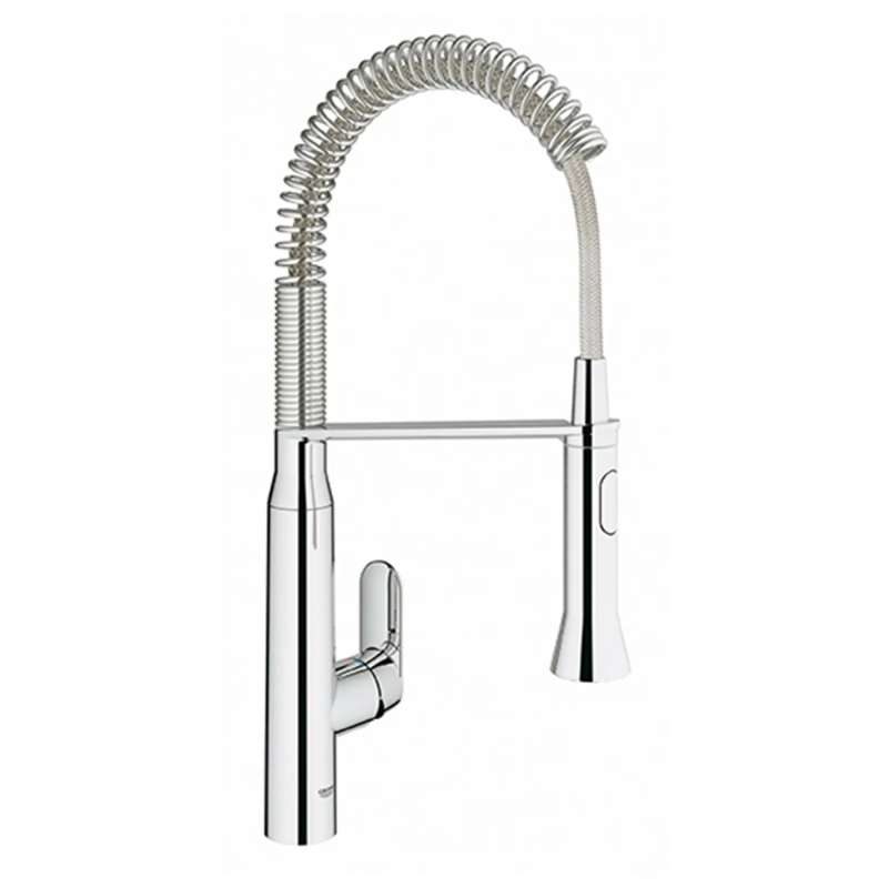 The K7 Single-Handle Semi-Pro Dual Spray Kitchen Faucet from GROHE is durable, dependable, and designed to give your kitchen a professional look without overpowering. Spring arm provides an extensive operating radius within the sink and swivels 360 deg for added versatility in a center island. Medium high spout and dual spray functions make every kitchen task easier, from filling pots to cleaning the sink and rinsing vegetables.