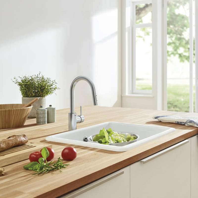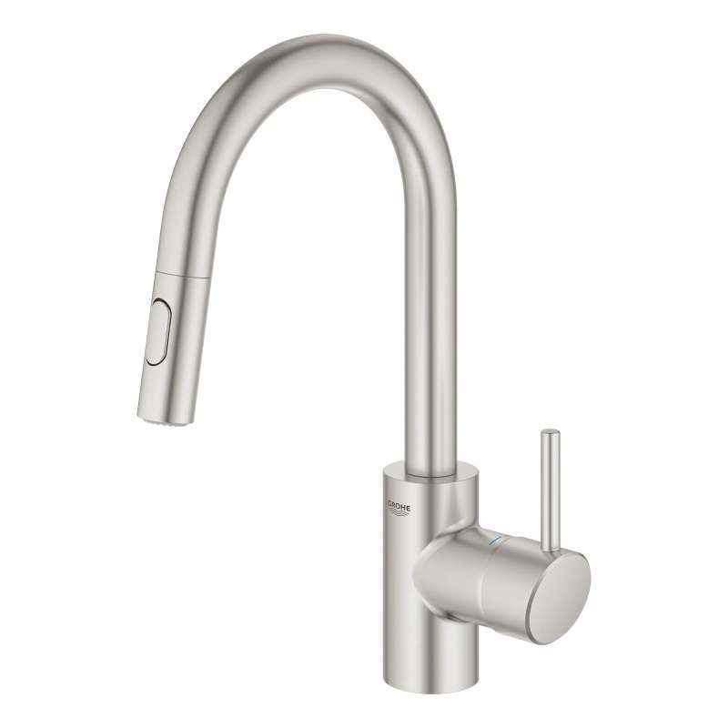 The GROHE Concetto Dual Spray Pull-Down Bar Faucet is a single-handle faucet engineered for superior performance. Perfect for entertaining or for a secondary kitchen sink, this single-handle faucet features a convenient pull-down spray head with toggles to switch between regular stream and spray functions for maximum versatility. This meticulously crafted, single-hole kitchen faucet has a high, swivel spout for ease when filling pots, and a lever handle that offers precise control of water pressure and temperature.