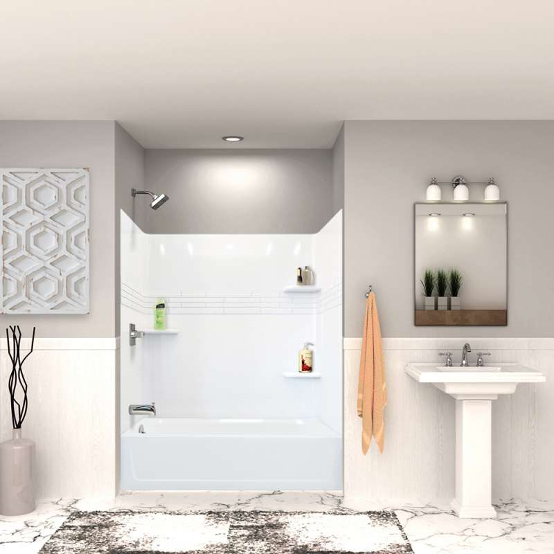 Effortless upgrade your bathroom with Mustee all-in-one bath/shower kits! These kits feature a timeless and classic design, meticulously crafted from premium materials to ensure years of lasting quality. They are designed for easy cleaning and maintenance, plus they're resistant to mold and mildew, making them a practical choice for any home. Transform your bathroom effortlessly with Mustee! Kit includes 60-in x 32-in bathtub and wall set.TOPAZ left-hand bathtub is molded using premium Varistone fiberglass and features an easy-to-clean semi-gloss finish and a 40-degree lumbar slope for relaxed reclining while soaking. TOPAZ fiberglass 3-piece wallset with tile pattern feature interlocking panels to form a blade and groove seal. Wallset fastens directly to stud wall. Smooth, semi-gloss finish is easy to clean, resists scuffs, and is mold and mildew-resistant. Includes three self-draining shelves ideal for shampoo, soap, and any other bathroom necessities.