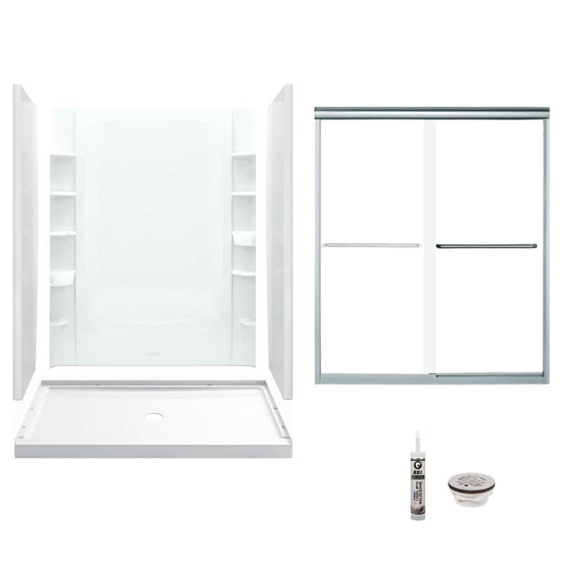 Kit includes shower base, back wall, end walls, shower door, drain, installation kit
