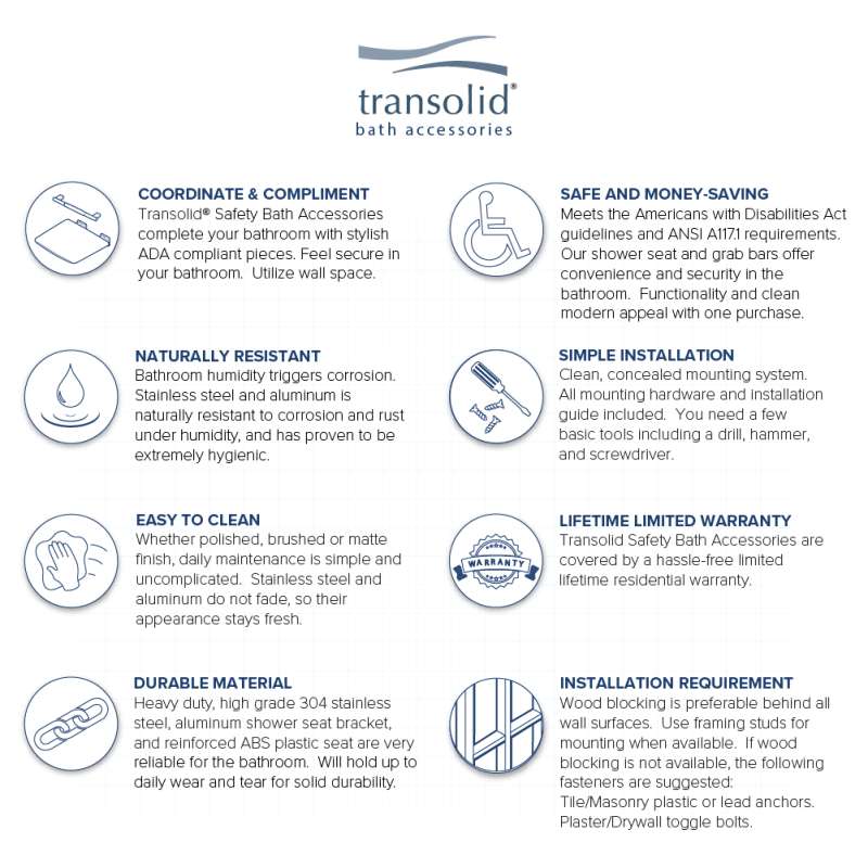 Kit includes Transolid Maddox collection fold-up shower seat, 16-in grab bar, and 12-in grab bar