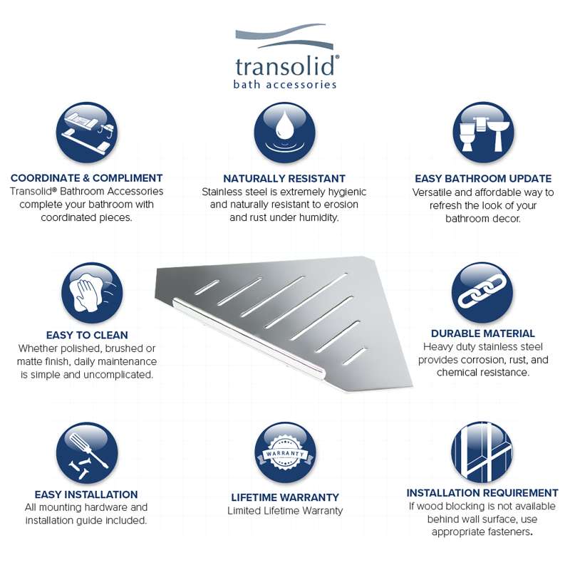 Transolid stainless steel grab bars shelves and corner shelves are beautiful, easy-to-install additions to Transolid Titan, Prodigy, Expressions, and SaraMar solid surface walls, or any other solid surface or tile shower. Achieve peace of mind with durable shelving with a featured rail that won’t let your shower products fall. Sleek, geometric lines create a clean, organized space for a versatile and affordable way to refresh the look of your bathroom décor. Corrosion, rust, and chemical resistant material ensures this sleek design will add to your space without adding to your to-do list.