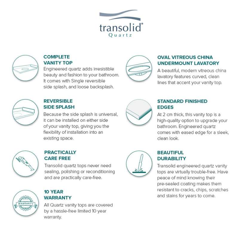 They say home is where the heart is - so why not create a special place to enjoy for years to come? With Transolid quartz vanity tops you'll experience a captivating and energizing color palette. Quartz is a nonporous surface that prevents unwelcome germs, bacteria, and mildew. Easy to maintain and clean. Lustrous surface that doesn't require sealing, conditioning or polishing and is scratch, heat, and stain resistant. Each Transolid quartz vanity top includes reversible sidesplash and loose backsplash.