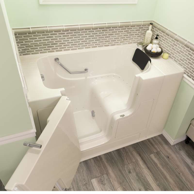The American Standard 30-in x 52-in Gelcoat walk-in bath provides a similar bathing experience to larger models but fits in smaller spaces and uses less water. The included tub extender allows this tub to retrofit in the same space as a standard bathtub. The full sized, outward opening, contoured door with a low door threshold allows ease of entry and exit. Fully equipped, the 105 Premium Series offers all the latest in safety and comfort features with the most advanced therapeutic options and backed by a lifetime warranty on the door seal, a 10 year warranty on the tub shell and a 5 year warranty on all other components.