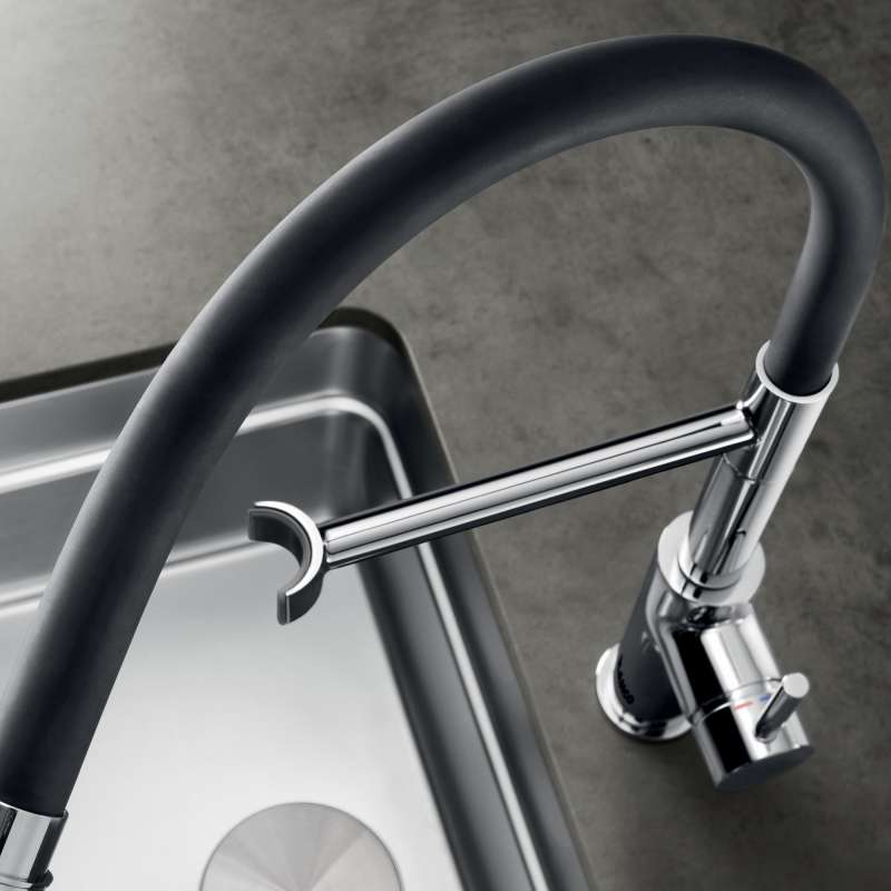 The CATRIS FLEXO offers a fresh take on the semi-professional faucet, combining functional elements and modern industrial flair. Designed to make cooking and cleaning more efficient than ever before, the CATRIS FLEXO boasts a 360-degree swivel for extended range of motion and a dual spray function to tackle everyday tasks from rinsing dishes to power washing dirty pots and pans. Its patented aerator significantly reduces limescale buildup, while its flexible, matte-black rubber hose provides a sleek, industrial look. The CATRIS FLEXO is built to deliver high performance for many years while providing long-lasting convenience. Easily pair your CATRIS FLEXO with your favorite BLANCO sink and accessories for a fully integrated BLANCO UNIT. With this setup, you'll have everything you need to drink, prep and clean all in one place.