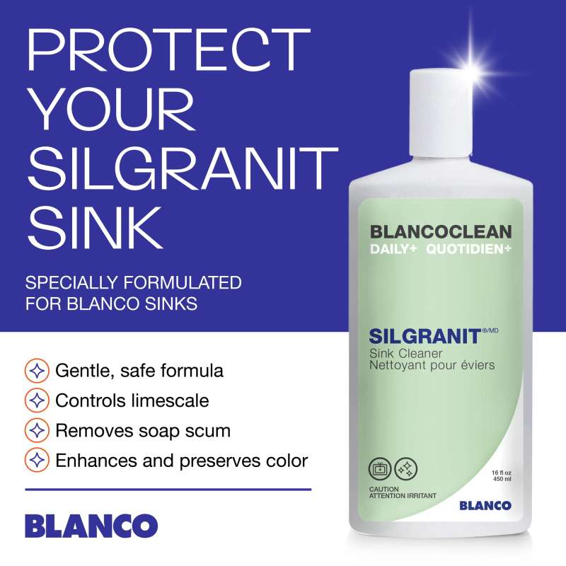 BLANCOCLEAN Daily+ SILGRANIT SINK CLEANER is a gentle formula that provides a deeper clean to reduce limescale and soap scum build-up. This cleaner is perfect for regular weekly cleanings of granite composite sinks. While Silgranit sinks are generally very low maintenance, they can still develop a white film or scum from dish soap or hard water and require regular cleaning. The most time spent in your kitchen is at your kitchen sink; this is where we perform many heavy-duty tasks throughout the day. Regular cleaning is the best form of maintenance and will protect your sink against everyday wear and tear. Keep your SILGRANIT sink looking its best with the BLANCOCLEAN DAILY+ SILGRANIT SINK CLEANER.
