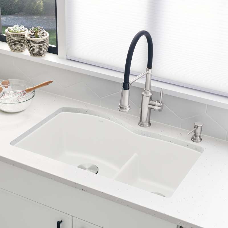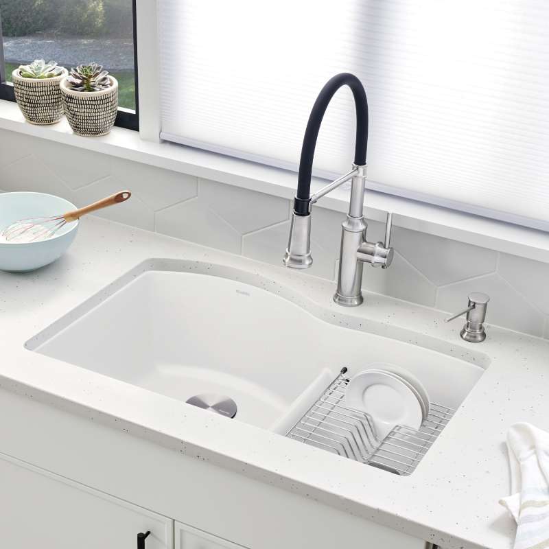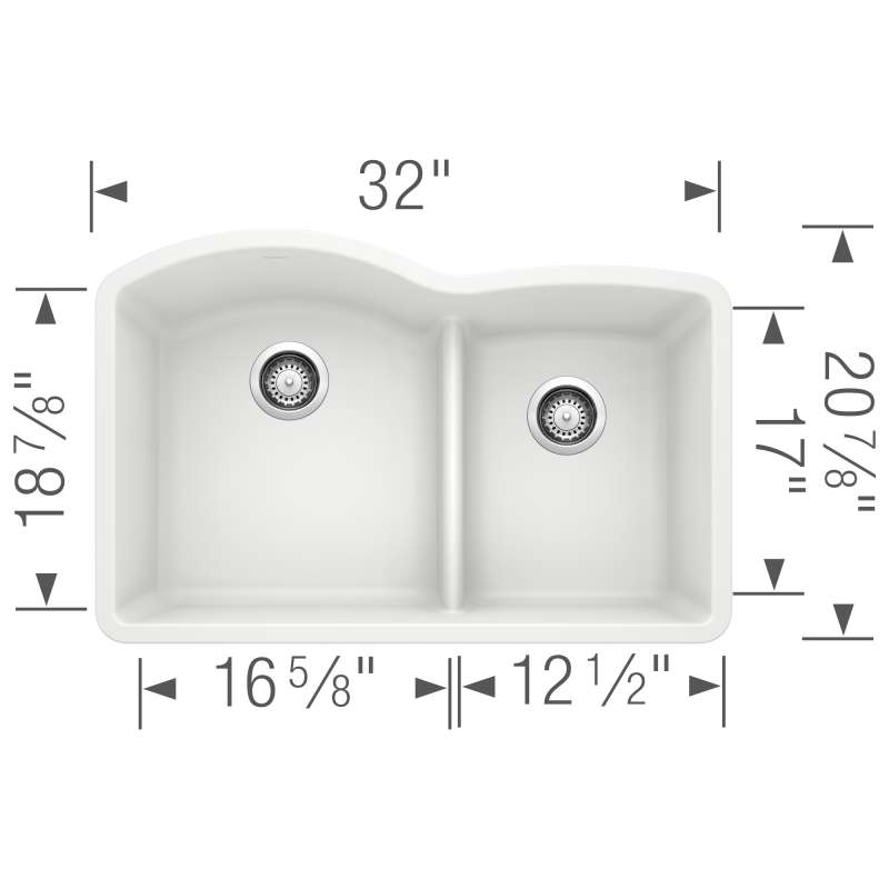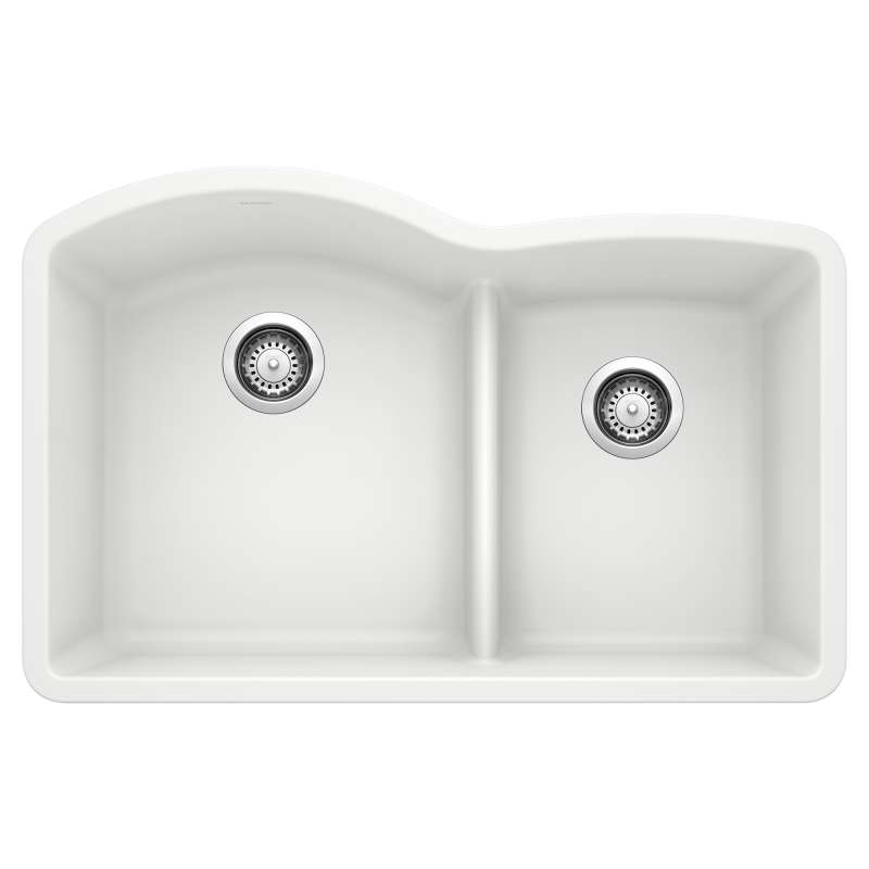 The DIAMOND 60/40 DOUBLE BOWL UNDERMOUNT KITCHEN SINK with LOW DIVIDE features a 60/40 bowl design with low partition, offering plenty of room for rinsing, washing, soaking, spraying and straining operations. The 60/40 bowl split allows for washing larger items while still leaving the smaller bowl open and the convenient low divide sits just 5-1/2" from the sink bottom, making it easier to handle large pots and baking sheets. Made of SILGRANIT(R), DIAMOND kitchen sinks are engineered to withstand heavy cookware and hot bakeware. Silgranit sinks are not only strong but also beautiful, available in a range of nature-inspired colors that effortlessly complement the latest kitchen trends. Combine the DIAMOND sink with a BLANCO faucet and accessories to create a BLANCO UNIT; a seamlessly integrated kitchen solution designed to transform kitchen chores into joyful experiences. Everything you need to drink, prep and clean, all in one place.