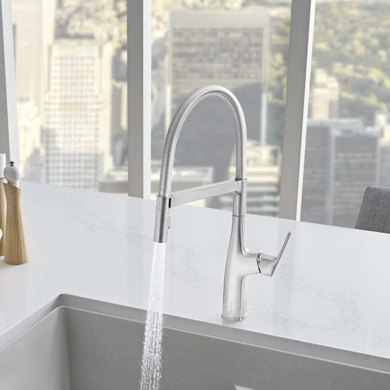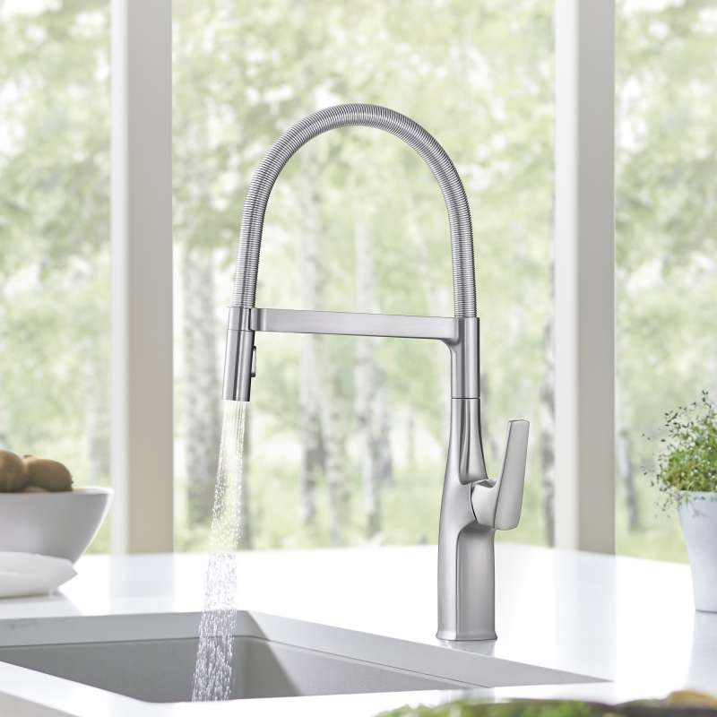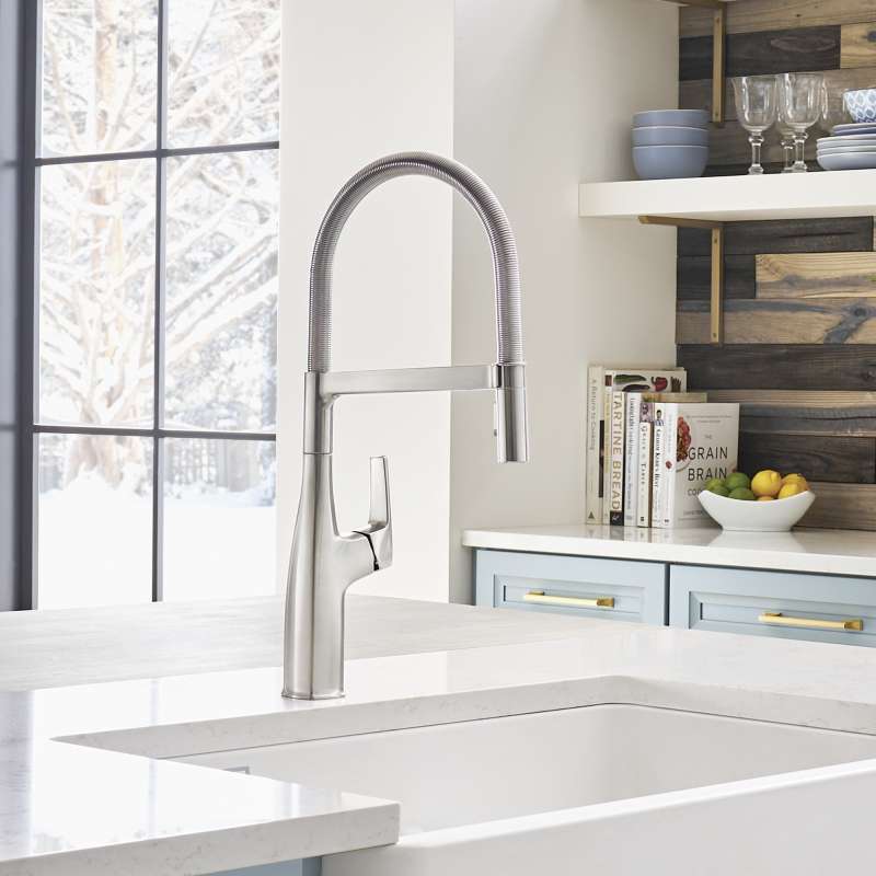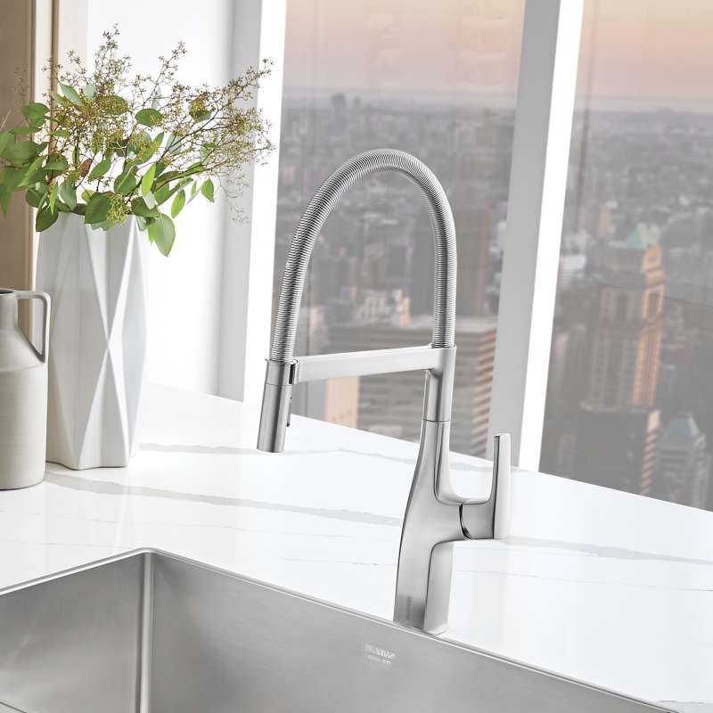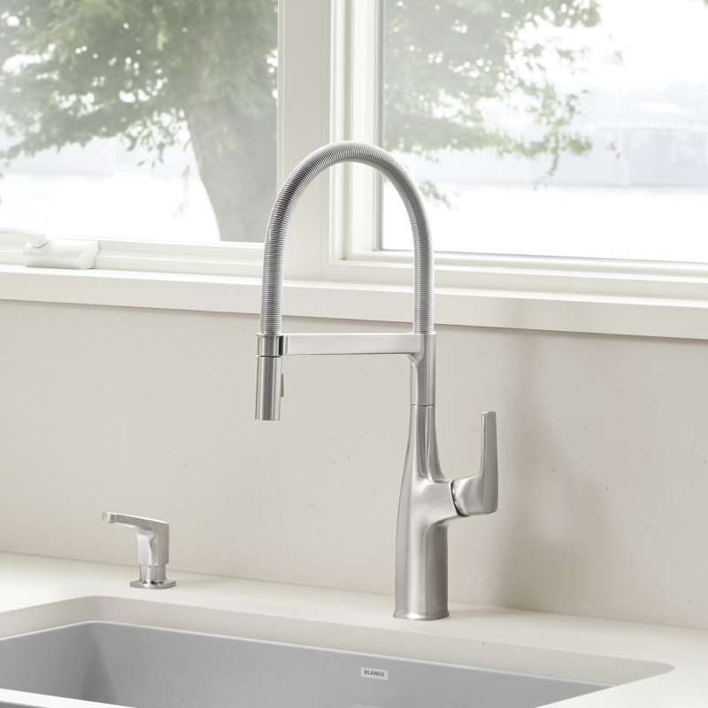 Where form and function unite. Inspired by faucets used in professional kitchens, BLANCO is the originator of the closed coil design and combines industrial style with modern appeal. The BLANCO RIVANA SEMI-PROFESSIONAL KITCHEN FAUCET delivers powerful performance with sleek design aesthetics. A clean, square design at the faucet base transitions into a rounded spout, blending organic shapes with ergonomic function. The BLANCO RIVANA provides home chefs with the ultimate in luxury and performance.