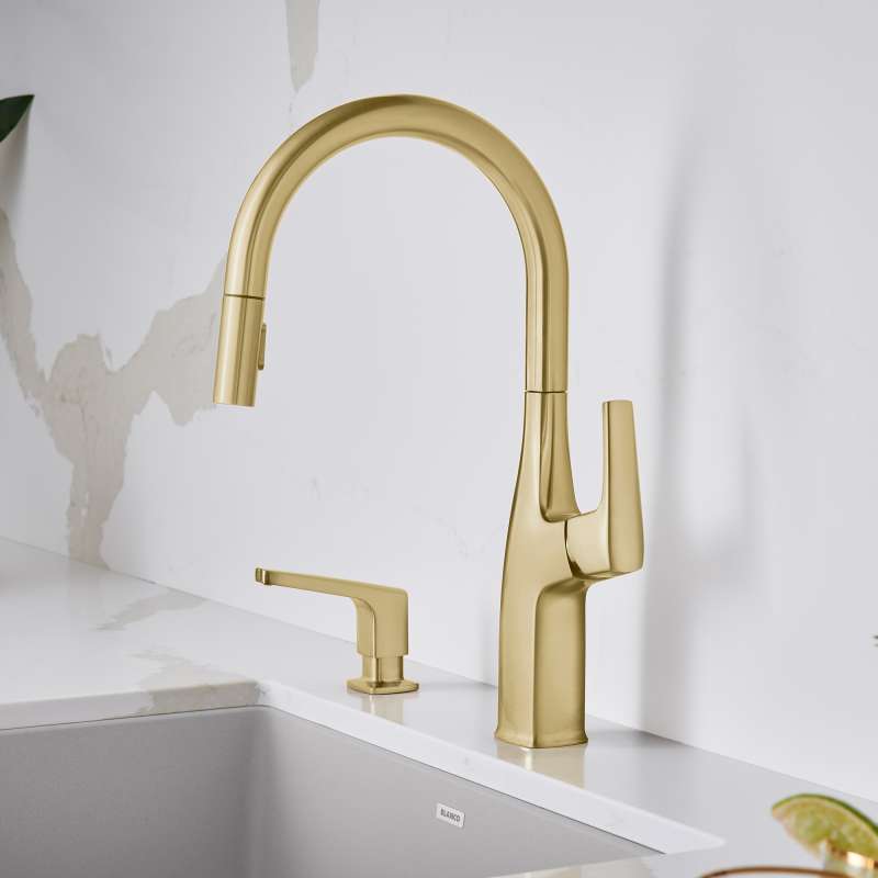 Where form and function unite. The BLANCO RIVANA HIGH-ARC KITCHEN FAUCET delivers powerful performance with sleek design aesthetics. A clean, square design at the faucet base transitions into a rounded spout, blending organic shapes with ergonomic function. The BLANCO RIVANA features a concealed spray-head for a streamlined, modern design. Featuring an insulated handspray with a dual-spray button, easily toggle between a solid stream or wide spray.